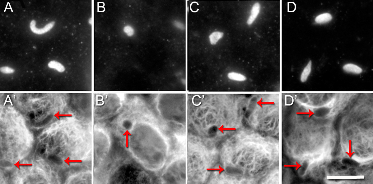 with antibodies to CP49 (A–D), and vimentin (A’–D’). The vermiform structure is clearly labeled with antibodies to CP49 in the upper panel, while the lower panel shows that
