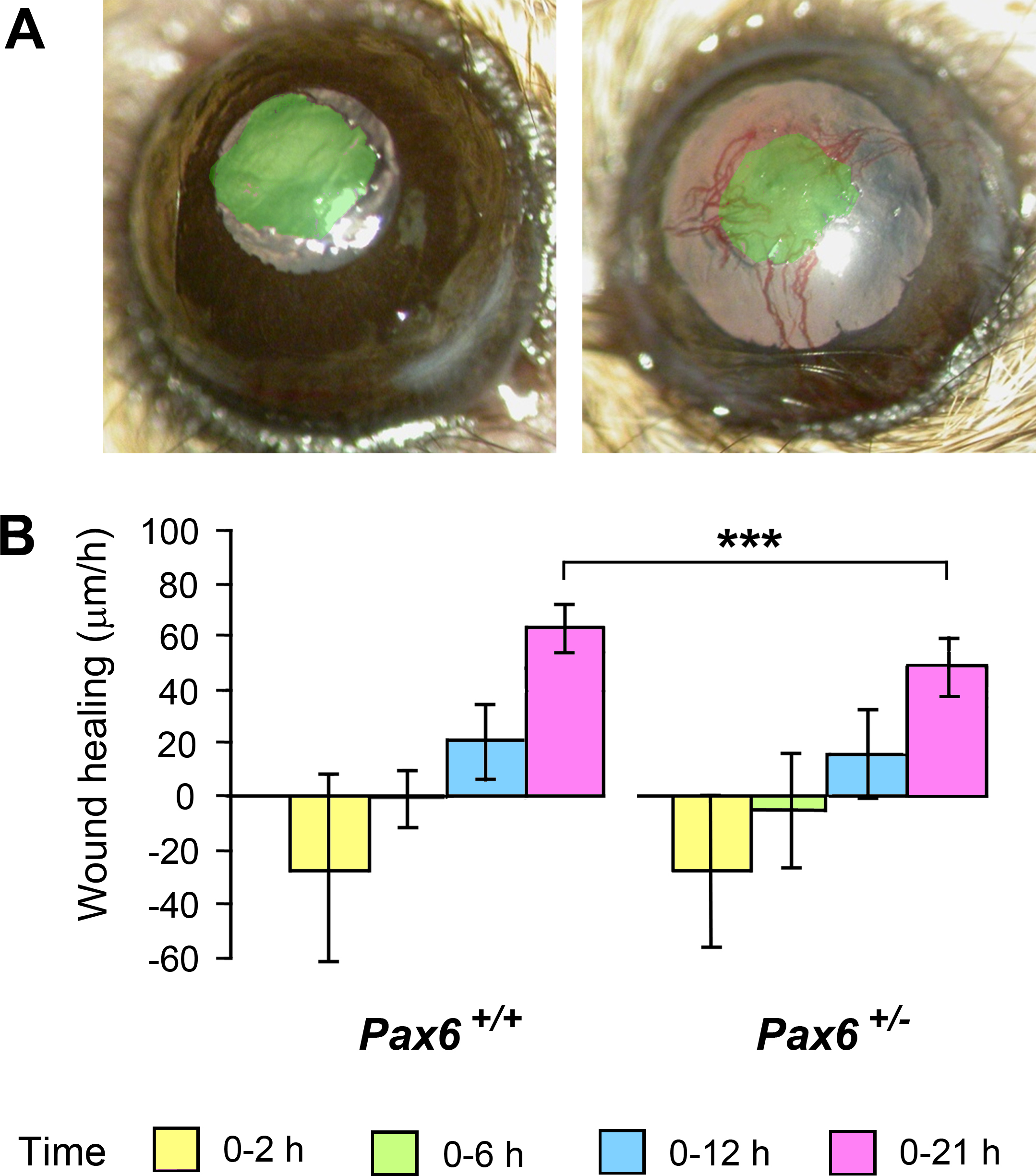 of the cornea is a variable feature of the chronic wound healing phenotype of Pax6+/− mice (discussed in the text). B: Rates of epithelial wound healing in wild-type (left) and Pax6+/− (right) adult mice. Mean rates of migration are given over 0–2 h, 0–6 h, 0–12 h, and 0–21 h. Means ± standard deviation are