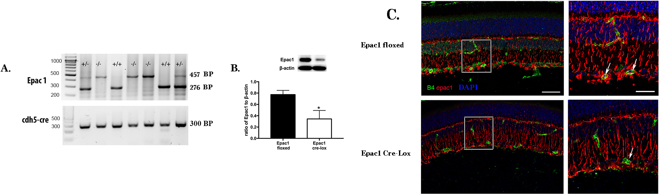 by Cdh5 Cre. Expected band sizes: Epac mutant 457 bp, wild-type 276 bp, Cdh5 Cre 300 bp. B: A significant reduction in the Epac1 protein levels from the whole retinal lysates. n = 5 mice in each group. C: Imaging data show the cellular localization of Epac1 in the retina from the Epac1 floxed and Epac1 Cre-Lox mice. The top