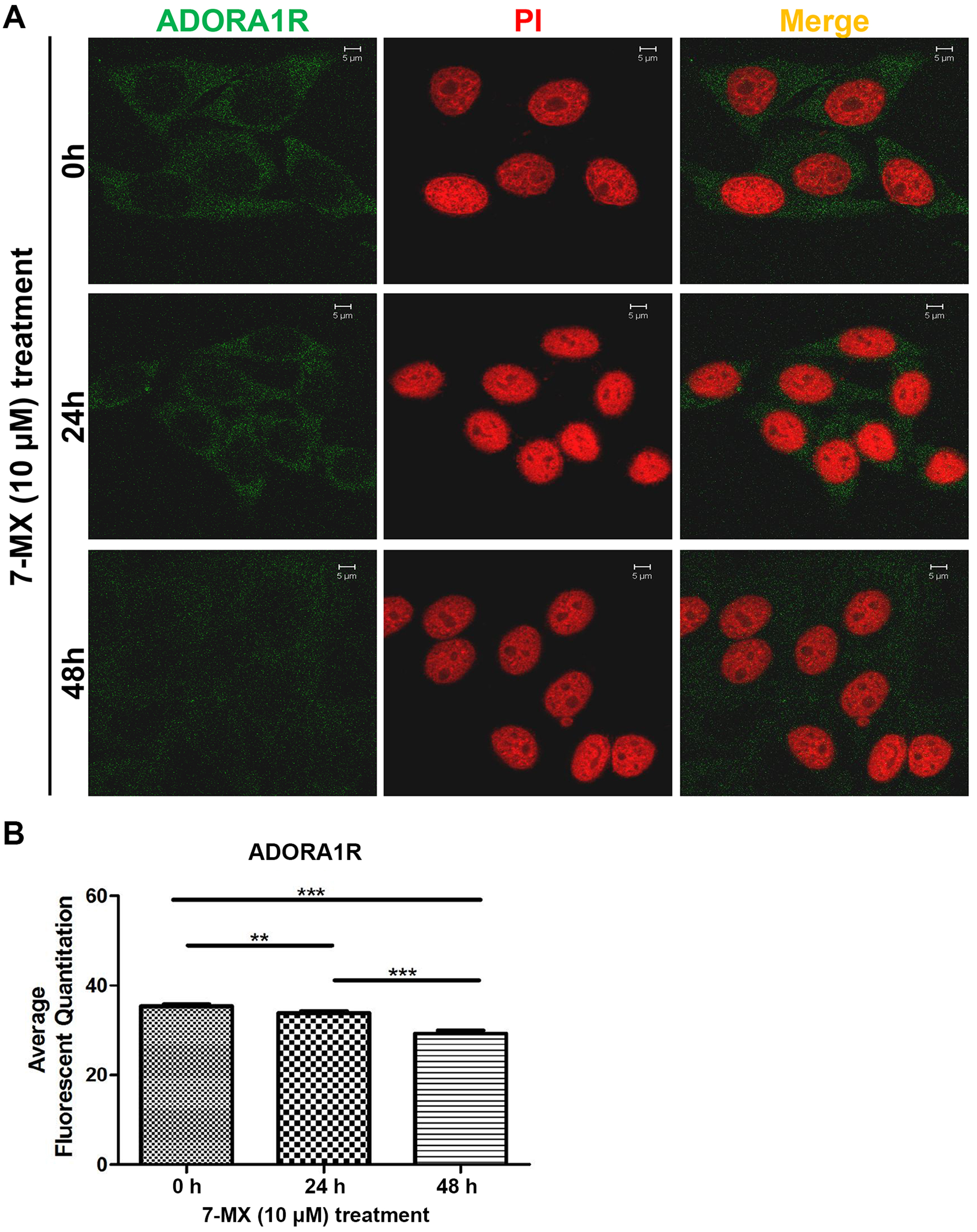with immunofluorescence. B: The mean fluorescence intensity of ADORA1R was decreased at 24 h (p<0.01), and even more obviously at 48 h, compared to