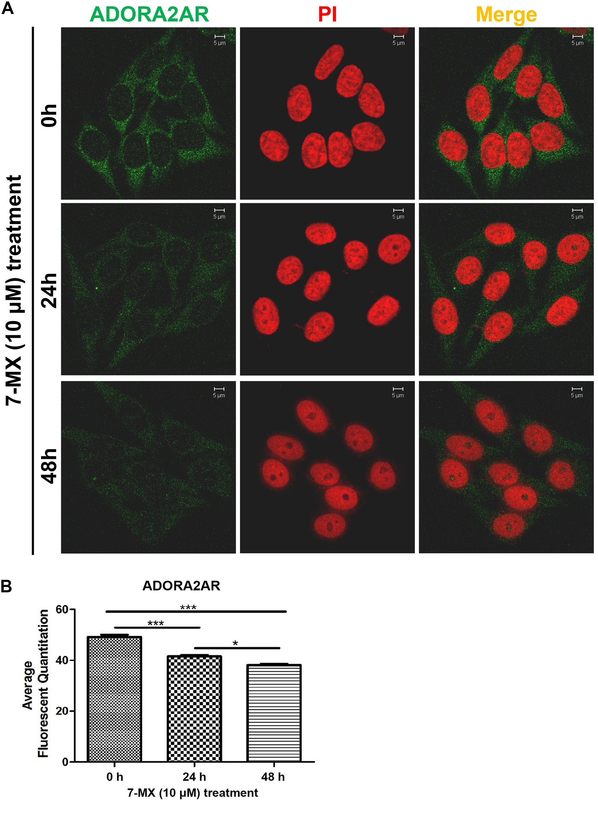 with immunofluorescence. B: The mean fluorescence intensity of ADORA2A was decreased at 24 h (p<0.001) and further decreased at 48 h compared to 24