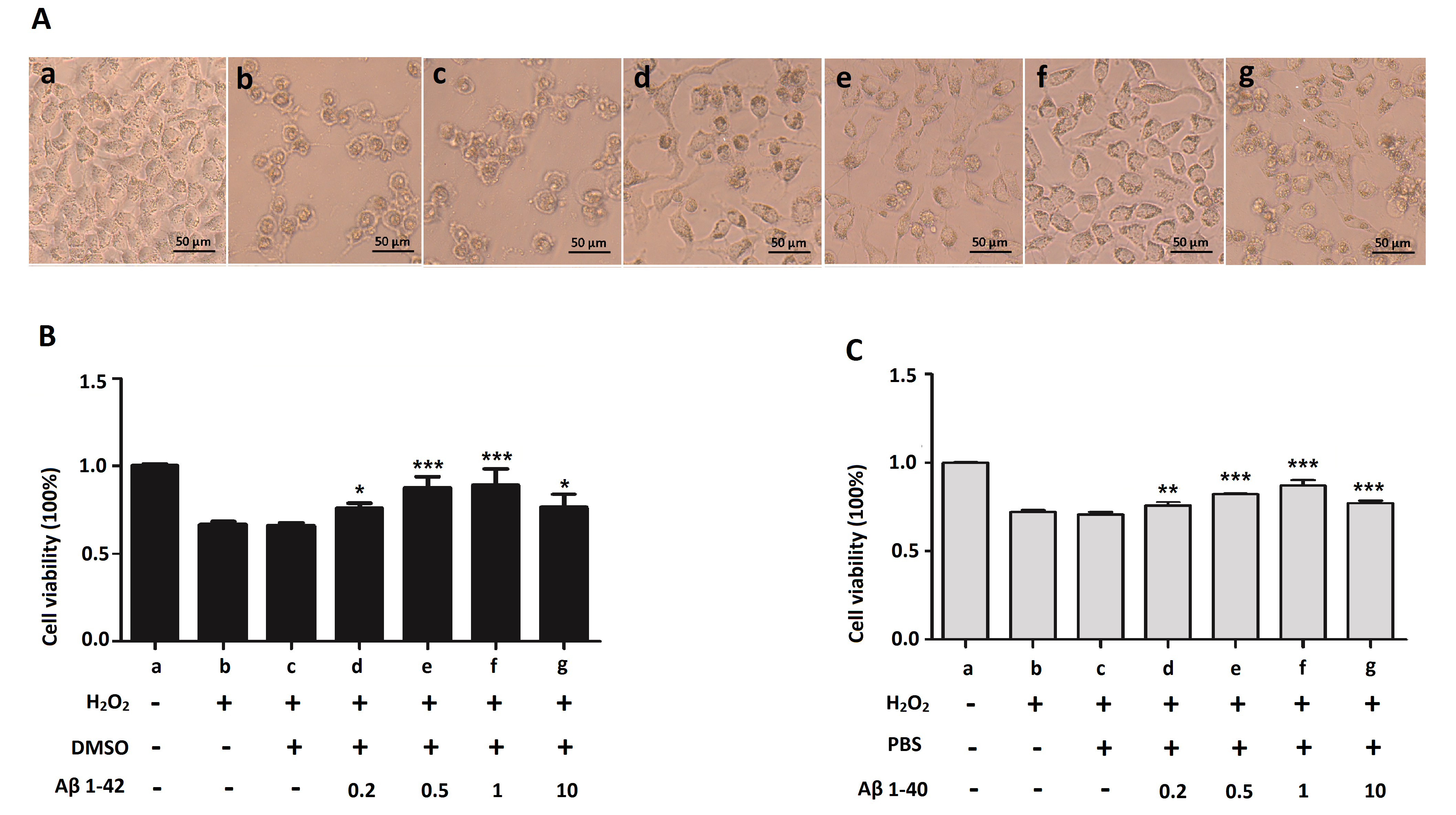 Figure 6. HLEC viability assay with or without Aβ intervention under oxidative stress. A: Inverted microscope investigation of cell morphology with or without β-amyloid (Aβ) 1–40 pretreatment under oxidative stress.