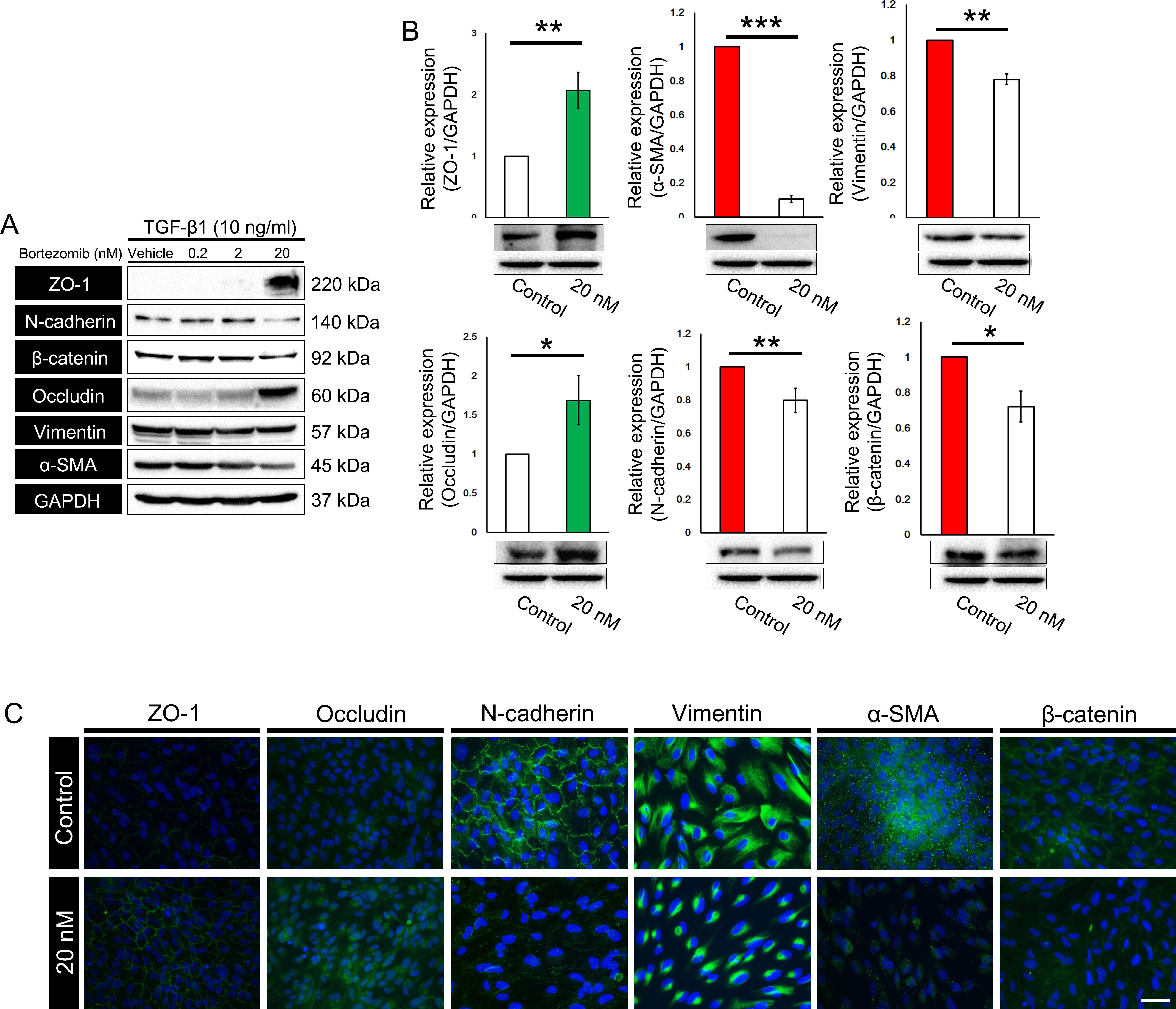 (TGF-β1, 10 ng/ml). At a concentration of 20 nM, treatment with bortezomib resulted in significant downregulation of mesenchymal