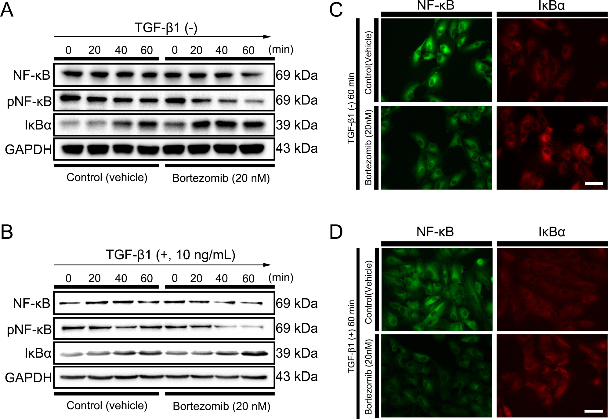 growth factor (TGF)-β1. C, D: Immunocytochemical staining at 60 min after the treatment with bortezomib yielded results similar to those for the western