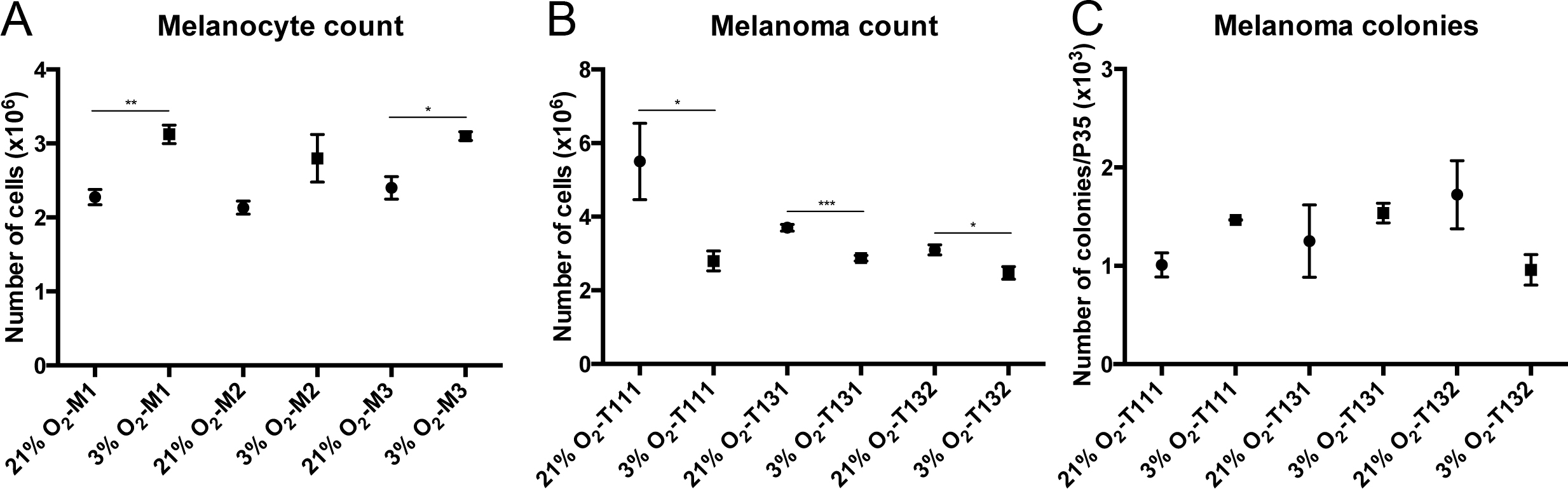 *p<0.05, **p<0.005, Student t test. B: Cell counts of uveal melanoma (UM) cells (n = 3) grown at 21% (•) or 3% (■) O2 were performed at three consecutive passages using a cell and particle counter (mean ± SEM). *p<0.05, ***p<0.0005, Student