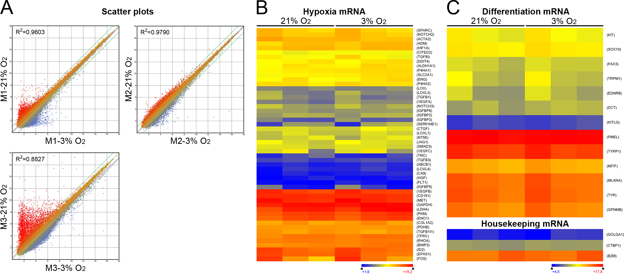 or 3% O2. C: Heatmap representation of mRNAs linked to melanocyte differentiation expressed by choroidal melanocytes expanded at 21%