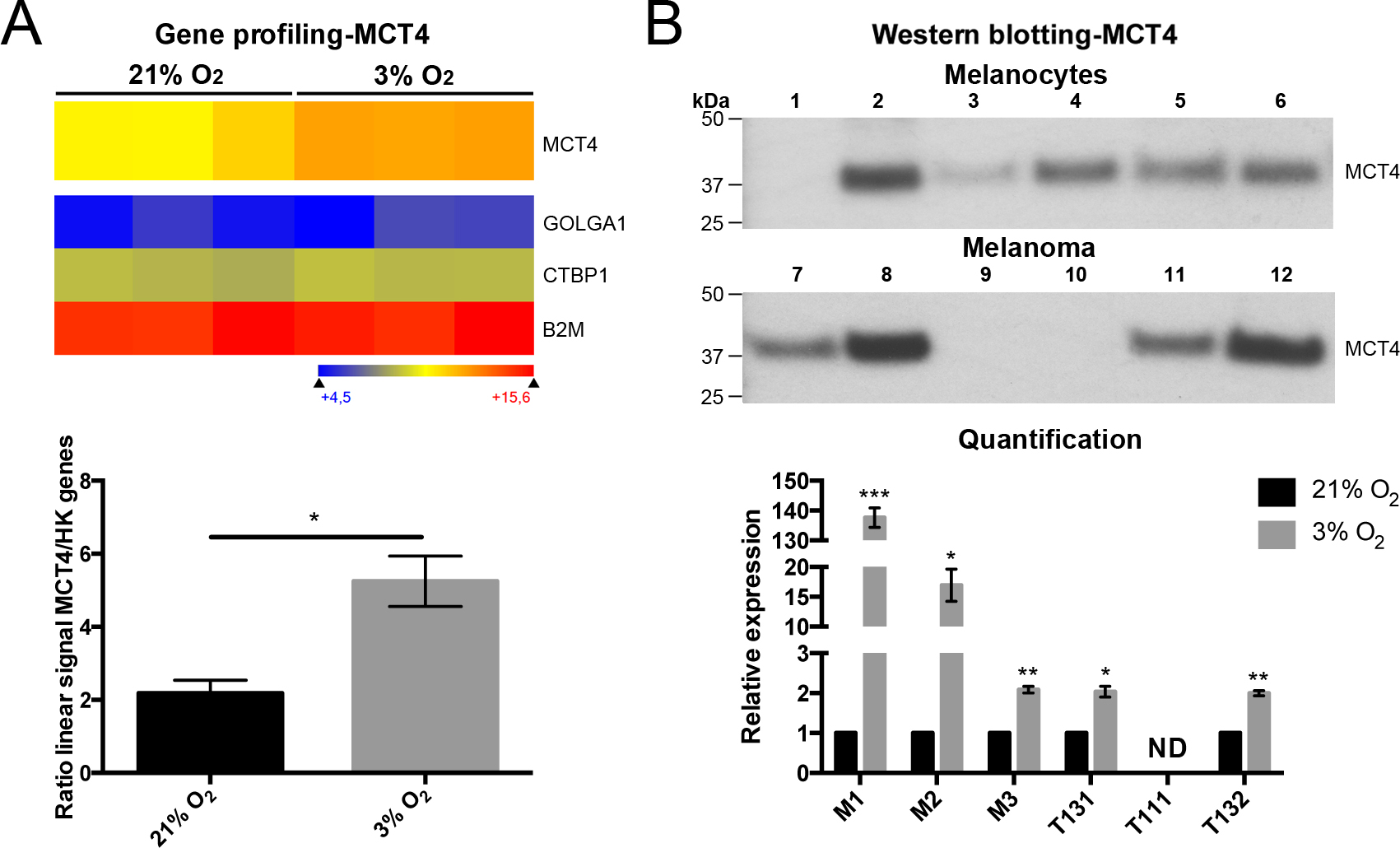 A: Heatmap representation of monocarboxylate transporter (MCT4) expressed by choroidal melanocytes grown at 21% or 3% O2 (n = 3/group). Data are also presented for the housekeeping mRNA golgin A1 (GOLGA1), C-terminal binding protein 1 (CTBP1),