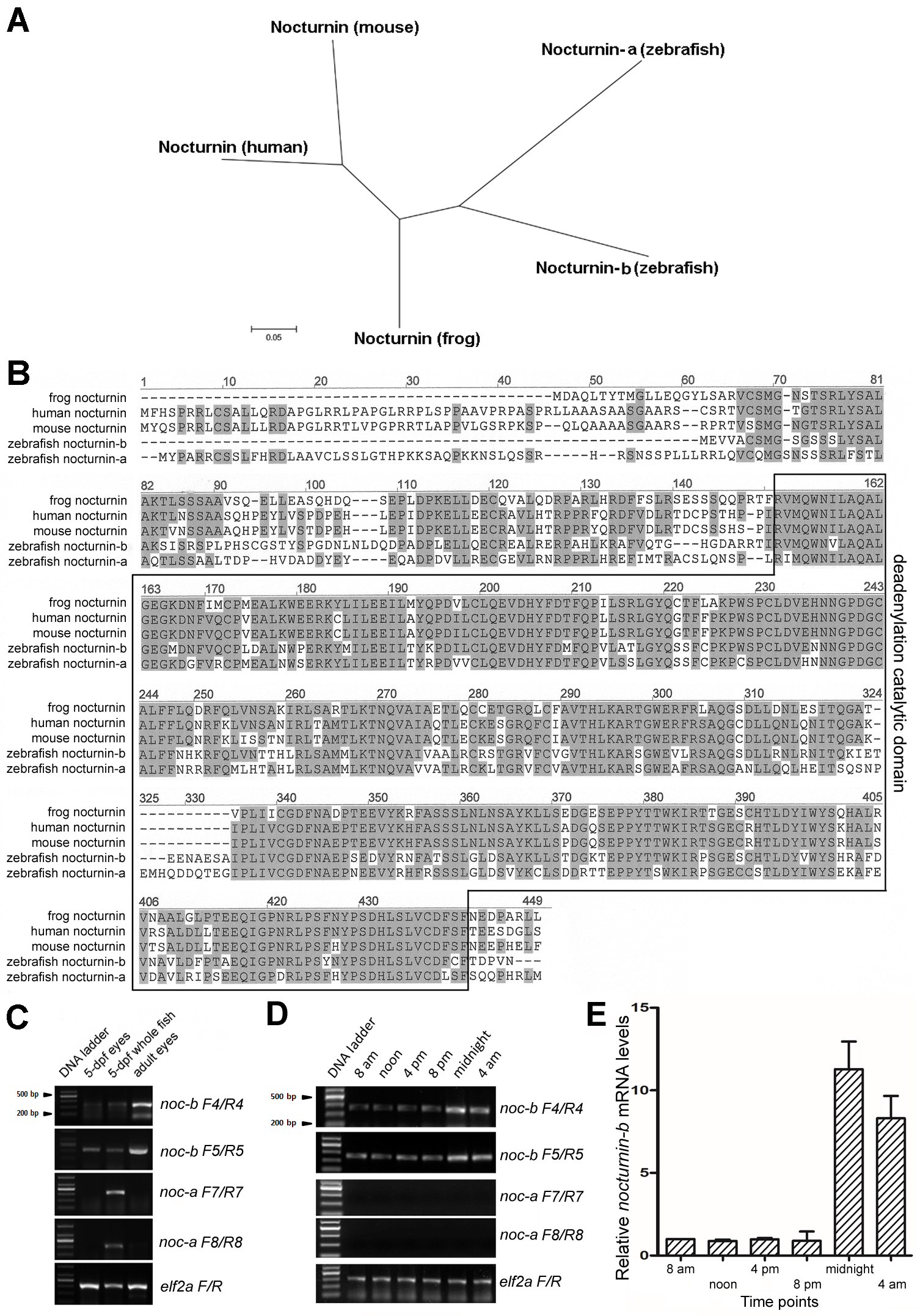 in gray. The deadenylation catalytic domain is boxed. C: An reverse transcription (RT)-PCR analysis with two primer pairs for each zebrafish nocturnin gene showed that nocturnin-b was expressed in 5-dpf and adult zebrafish eyes, as well as in 5-dpf whole larval fish, whereas nocturnin-a expression was not detectable in the eyes, although it was detectable in the 5-dpf whole larval fish. D: RT–PCR analysis of nocturnin-a and nocturnin-b expression in adult eyes at 8 AM, 12 PM, 4 PM, 8 PM, 12 AM, and 4 AM, noting prominent nocturnin-b expression but undetectable nocturnin-a expression. E: Quantitative real-time PCR (qRT-PCR) revealed the rhythmic changes in nocturnin-b expression in zebrafish adult eyes at the 8 AM, 12 PM, 4 PM, 8 PM, 12 AM, and 4 AM y-axis, fold differences between nocturnin-b and elf2a, normalizing against the level at 8 AM. Error bars (standard deviations) are based on three experiments.