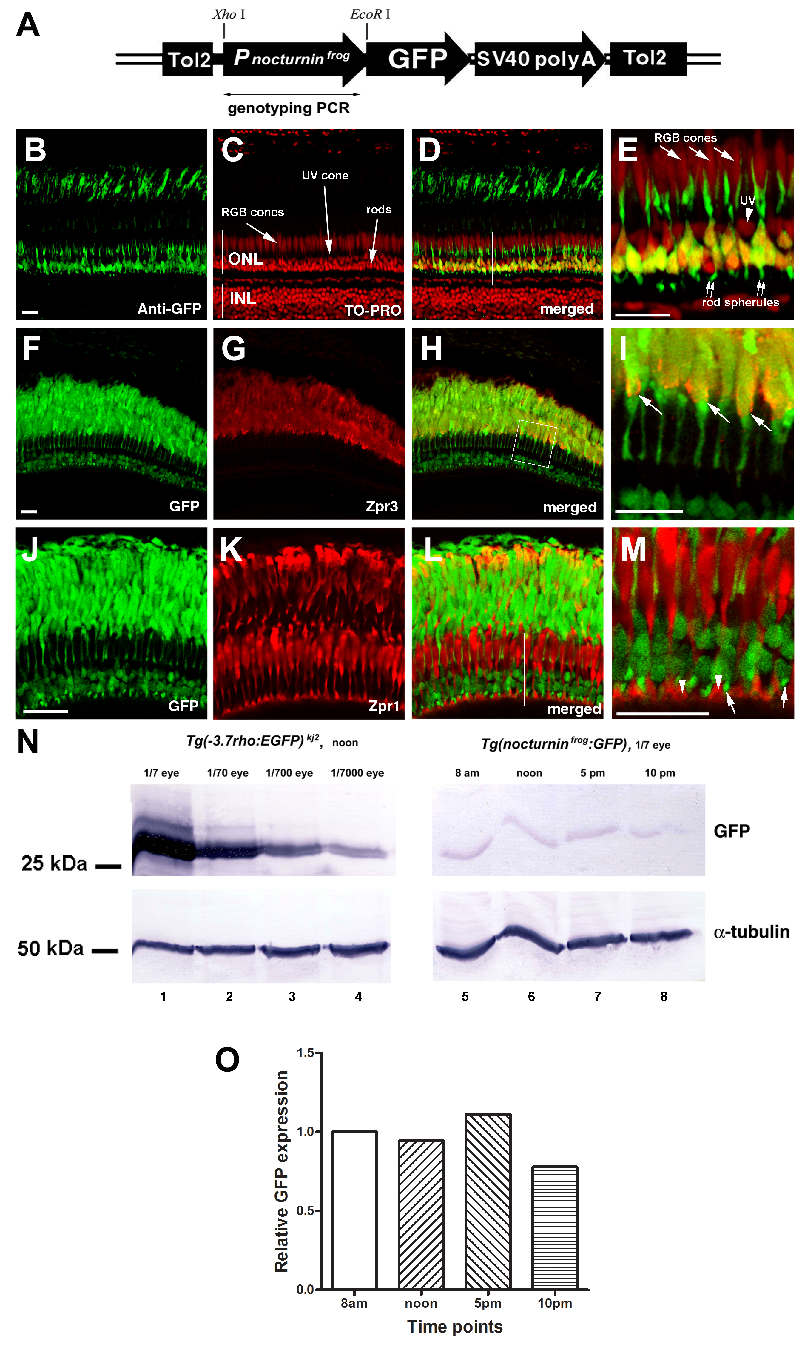 to scale. A double-headed arrow indicates the region that was amplified when the fish was PCR genotyped. B–E: In Tg(nocturninfrog:GFP) pt158, GFP immunostaining highlighted rods. GFP was enriched in the rod cell nuclei in the basal half of the outer nuclear layer