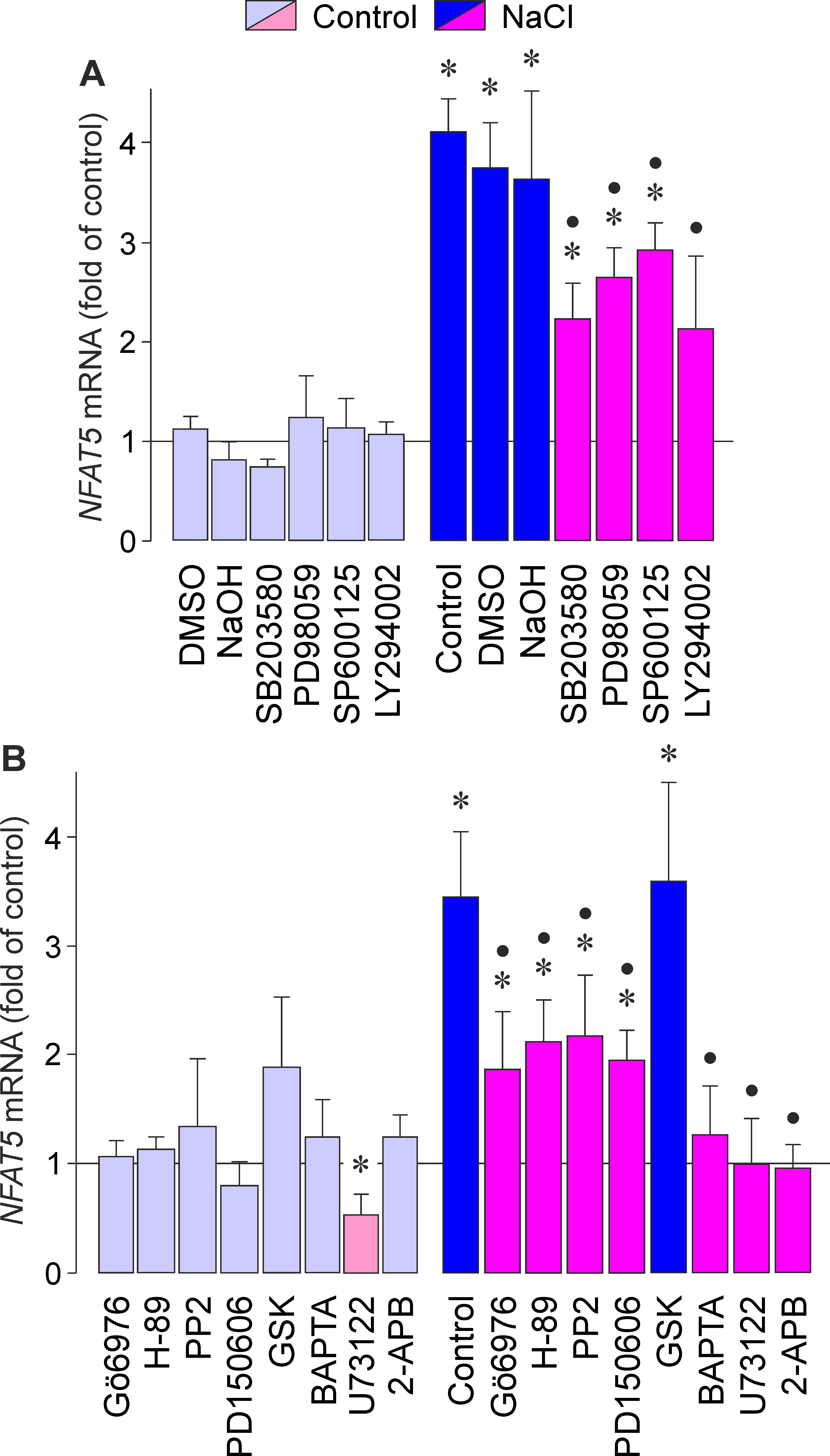 (+100 mM NaCl) media. A: Involvement of intracellular signal transduction pathways. The following blocking agents were tested: the inhibitor of p38