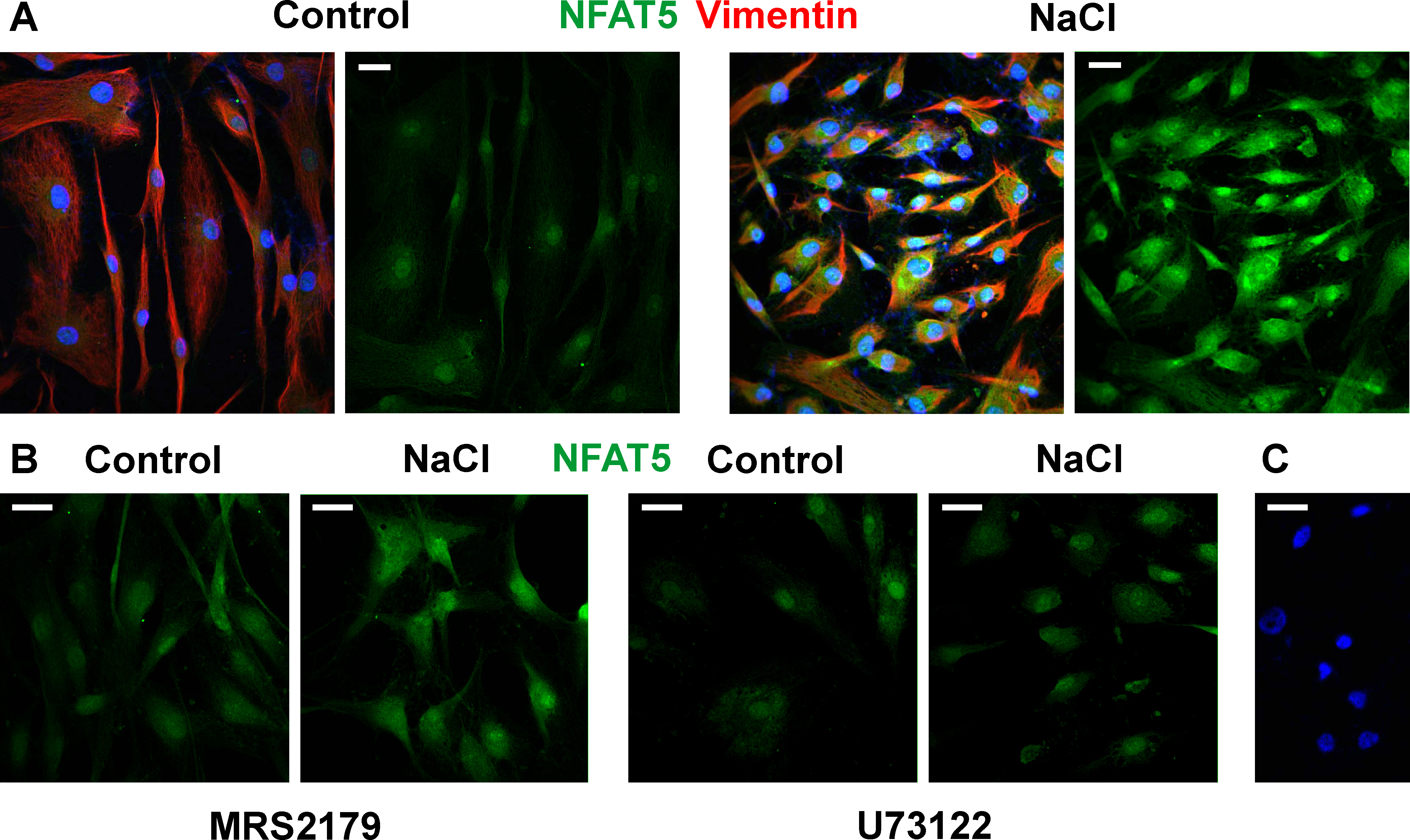 antibodies against NFAT5 (green) and vimentin (red). Cell nuclei were stained with Hoechst 33,342 (blue). A: Cells were cultured 6 h in iso- (control; left) and hyperosmotic (+100 mM NaCl) medium (right), respectively. Note the increased NFAT5 immunoreactivity and the altered shape of cells cultured in hyperosmotic medium