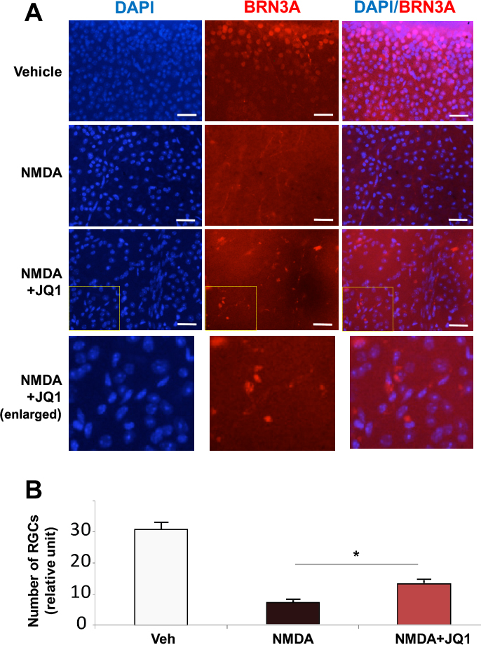 Figure 2. JQ1 ameliorates NMDA-induced RGC loss counted on retinal whole mounts. Intravitreal injections were performed as described