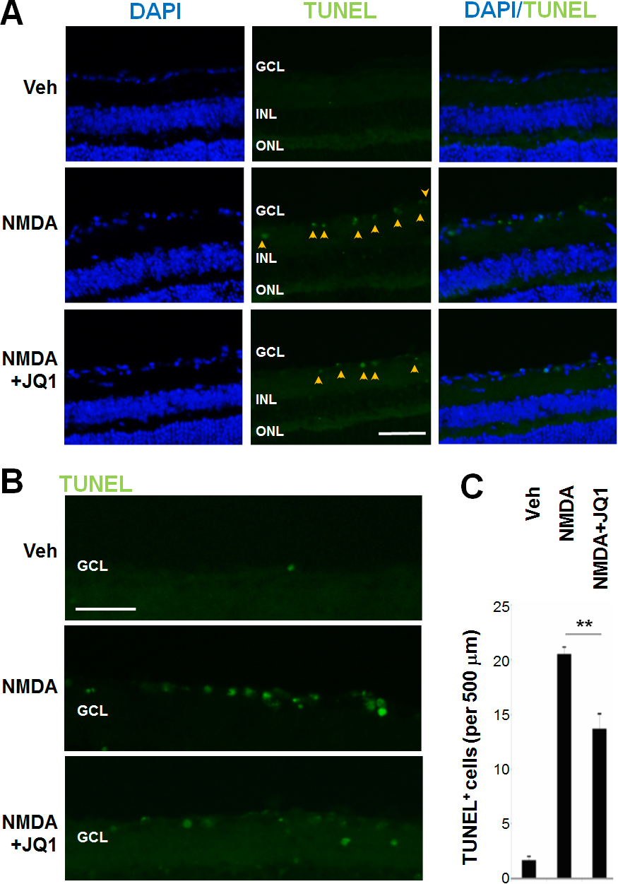 Figure 4. JQ1 attenuates NMDA-induced increase of TUNEL-positive cells. Intravitreal injections were performed as described in