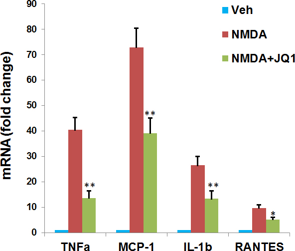 Figure 5. JQ1 inhibits NMDA-induced increase of inflammatory cytokine expression. Intravitreal injections were performed as described
