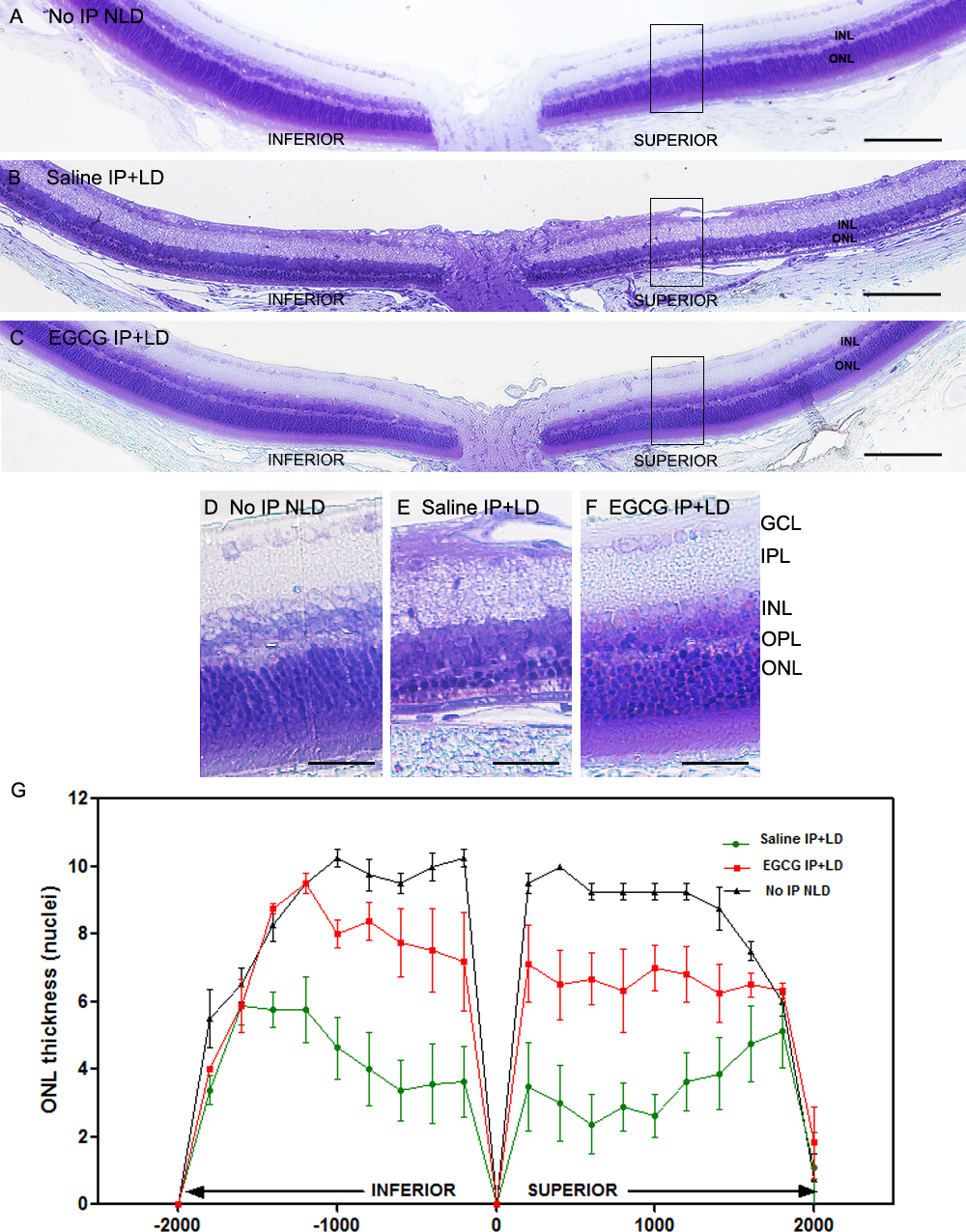 damage, especially in the superior area (scale bars = 100 µm). D-F: High magnification images of A-C (scale bars = 25 µm). G: Plots of the thickness of the ONL, measured in numbers of photoreceptor nuclei per column. Measurements were made in triplicate