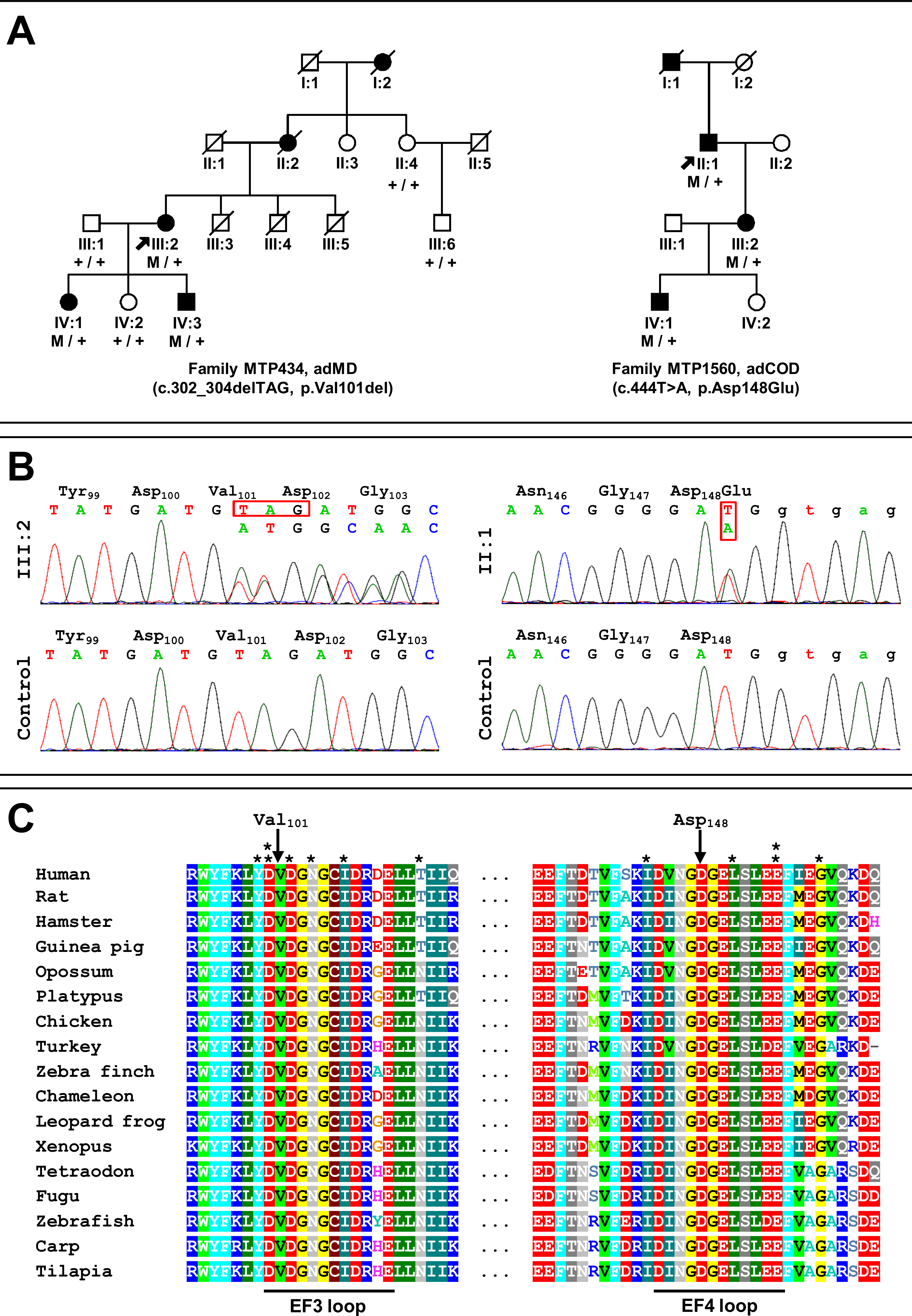 and c.444T>A mutations. C: Multiple amino acid sequence alignment of GCAP1 for a region surrounding the novel p.Val101del and the p.Asp148Glu mutations.