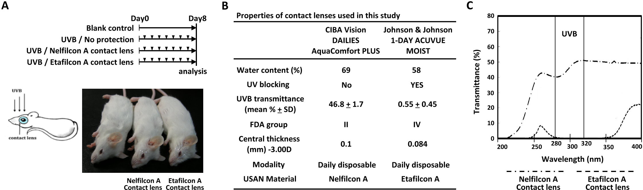 (UVR). B: The properties of the contact lenses used in this study. C: The UV transmittance properties of the Etafilcon A and Nelfilcon A contact lenses.