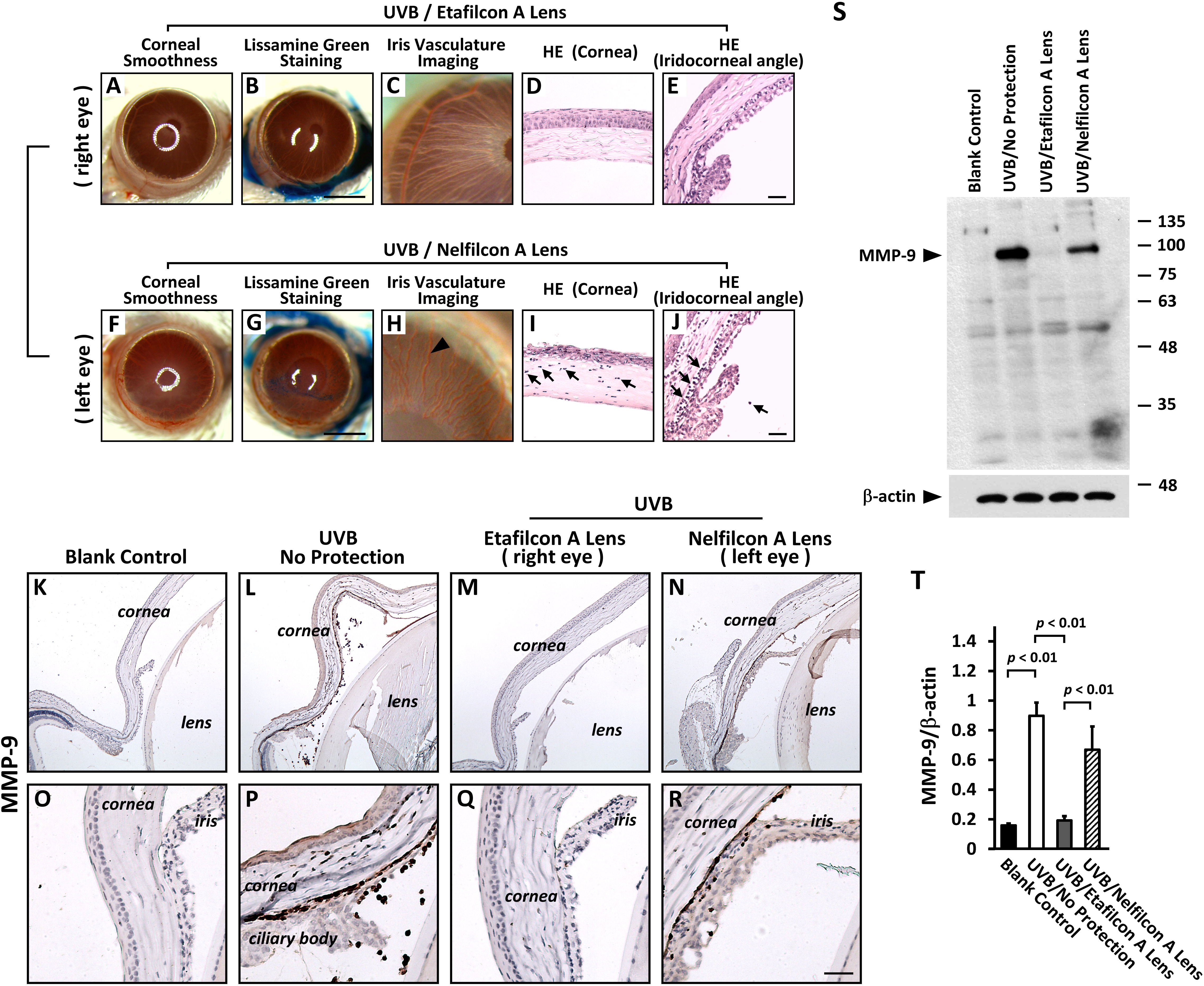 in H indicate the hyperemic iris. The arrow in I and J indicate the infiltrating leukocytes. K-R: The expression of MMP-9 protein was found in the infiltrating leukocytes of corneal stroma (P), anterior chamber (L, N), and iridocorneal angle (P, R) after UVR. S: The protein levels of MMP-9 was evaluated by western blotting. T: Quantitative analysis of MMP-9 protein in the anterior segment of eye (n=4 per group). Scale bars: 25 μm. The p<0.01 indicated