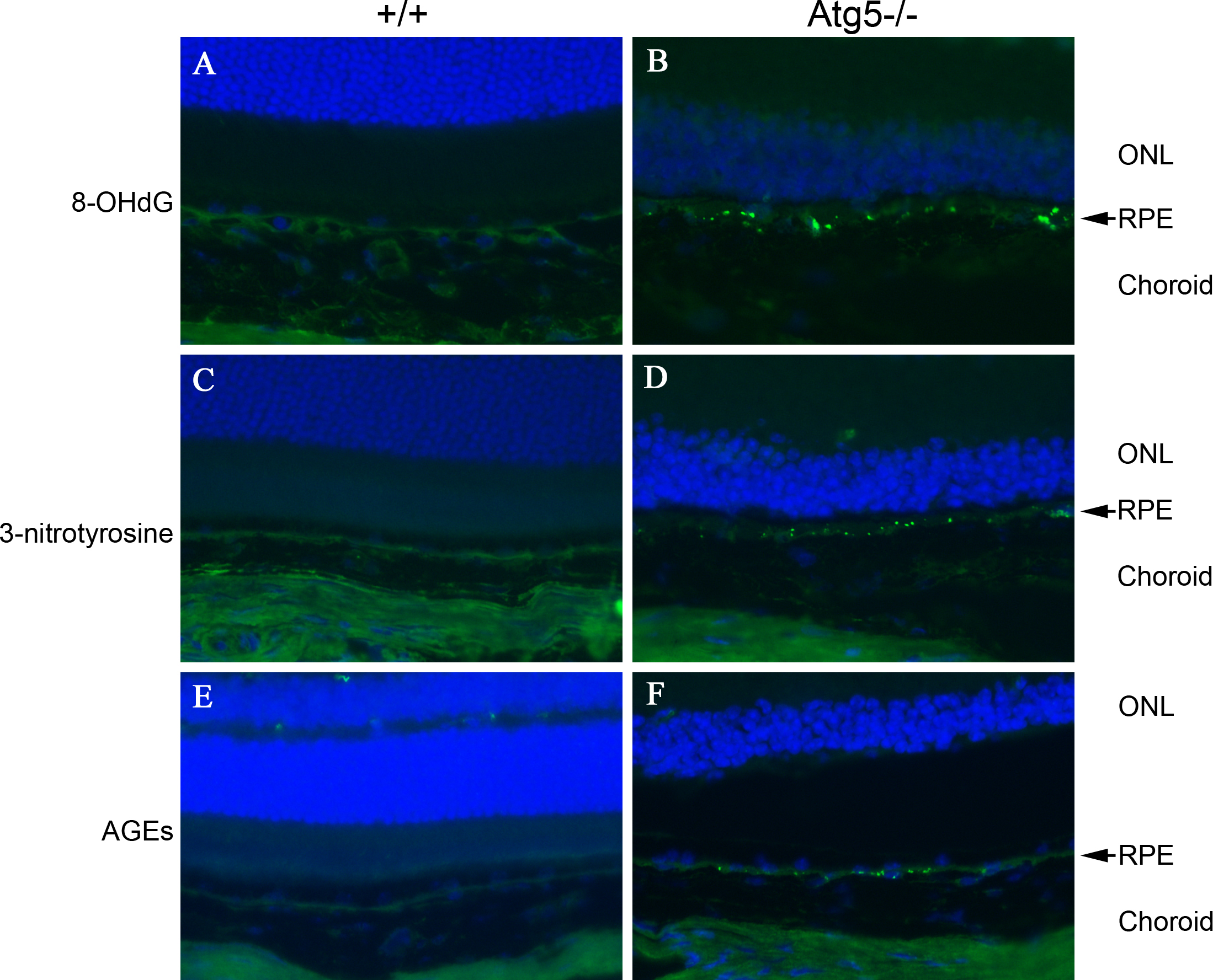Figure 2. Increased levels of oxidized proteins and DNA in the RPE of aged Atg5ΔRPE mice. Frozen sections from 8-month-old wild-type (+/+; A, C, E) and Atg5ΔRPE (Atg5−/−; B, D, F) mice were stained with antibodies (green signal) against 8-hydroxy-2’-deoxyguanosine (8-OHdG; A and B), 3-nitrotyrosine (C and D), or advanced glycation end products (AGEs; E and F). Note the bright green punctate staining in the RPE of the Atg5ΔRPE mice. The nuclei were stained with 4’,6-diamidino-2-phenylindole (DAPI; blue signal).