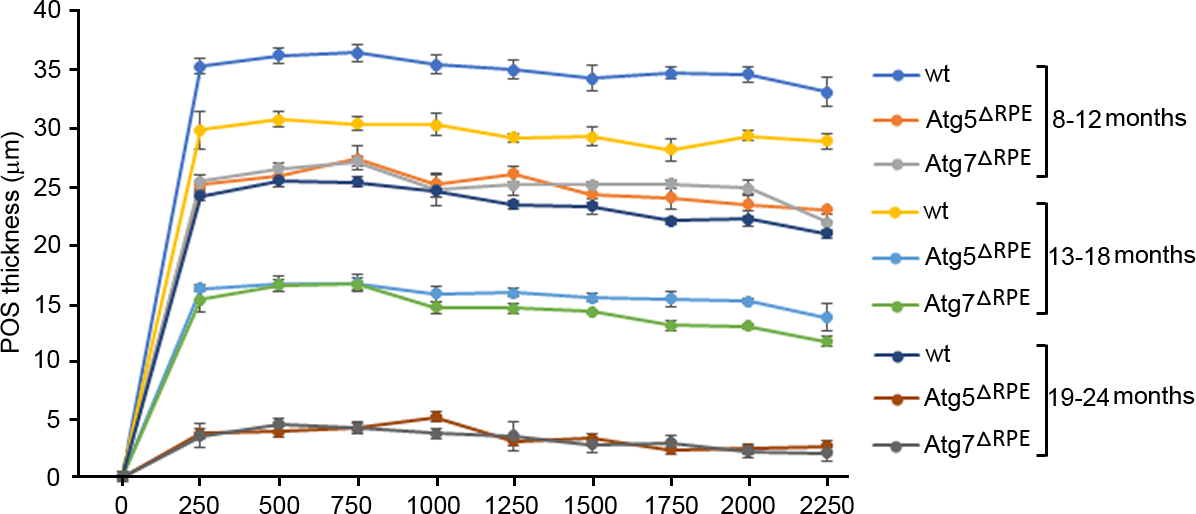 Figure 6. POS thickness in Atg5ΔRPE and Atg7ΔRPE mice with retinal degeneration. The thickness of the photoreceptor outer segment (POS) was measured in the retinas of the