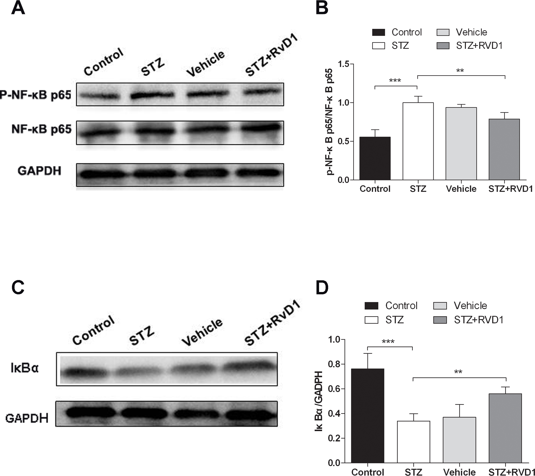 Figure 4. RvD1 alleviated the phosphorylation of NF-κB and degradation of IκBα in the retinas of STZ-treated rats. A: Western blot analysis of the nuclear factor kappa beta (NF-κB) phosphorylation in the retinas of diabetic rats with or without