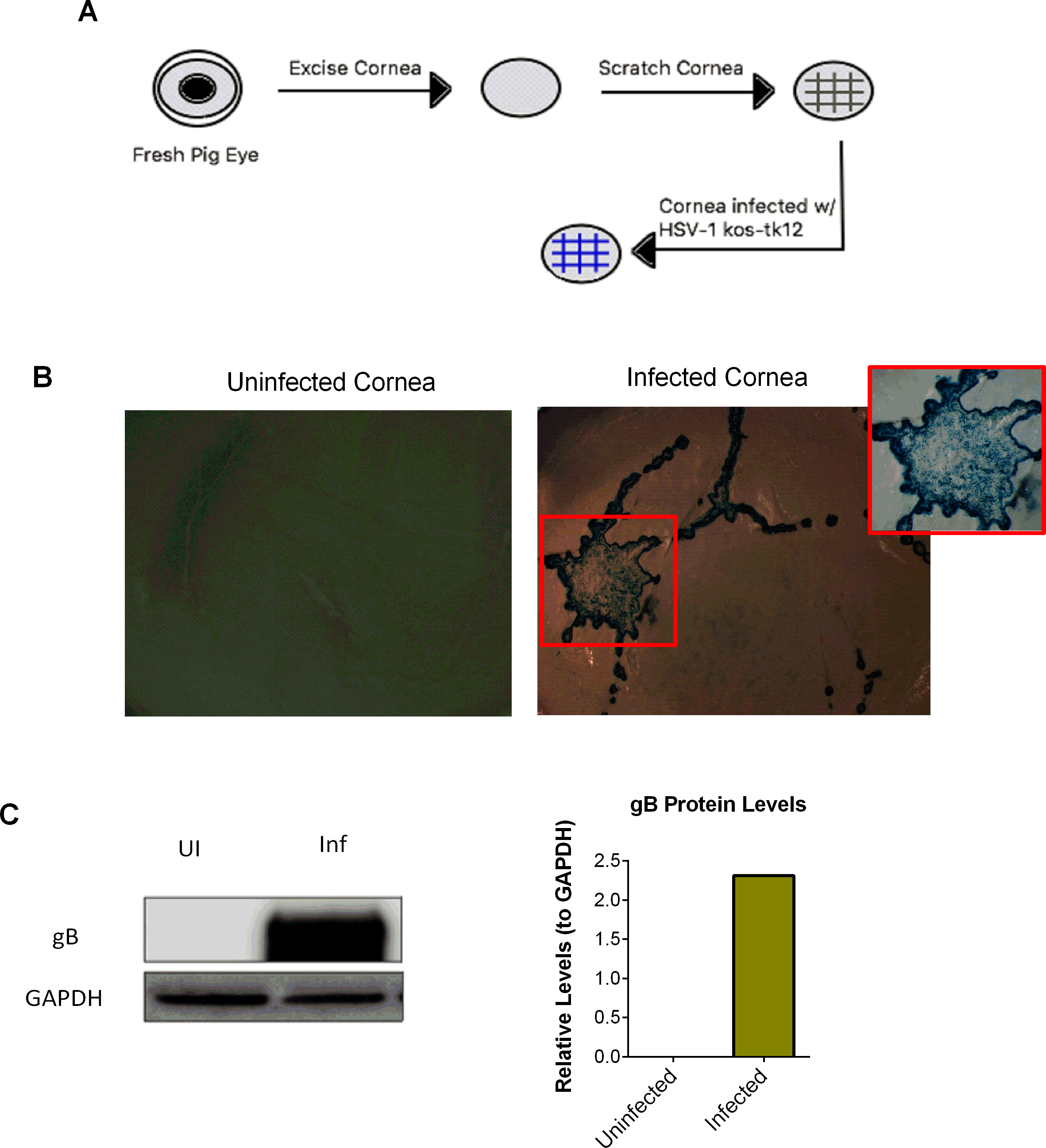 Figure 2. Development of ex vivo pig corneal model for HSV-1(KOS)tk12 infection. A: General schematic of major steps undertaken to develop pig cornea cultures harvested from pigs aged 180-200 days. B: Representative images taken via a modular stereo microscope of uninfected and infected cornea treated with the 5-bromo-4-chloro-3-indolyl-β-D-galactoside