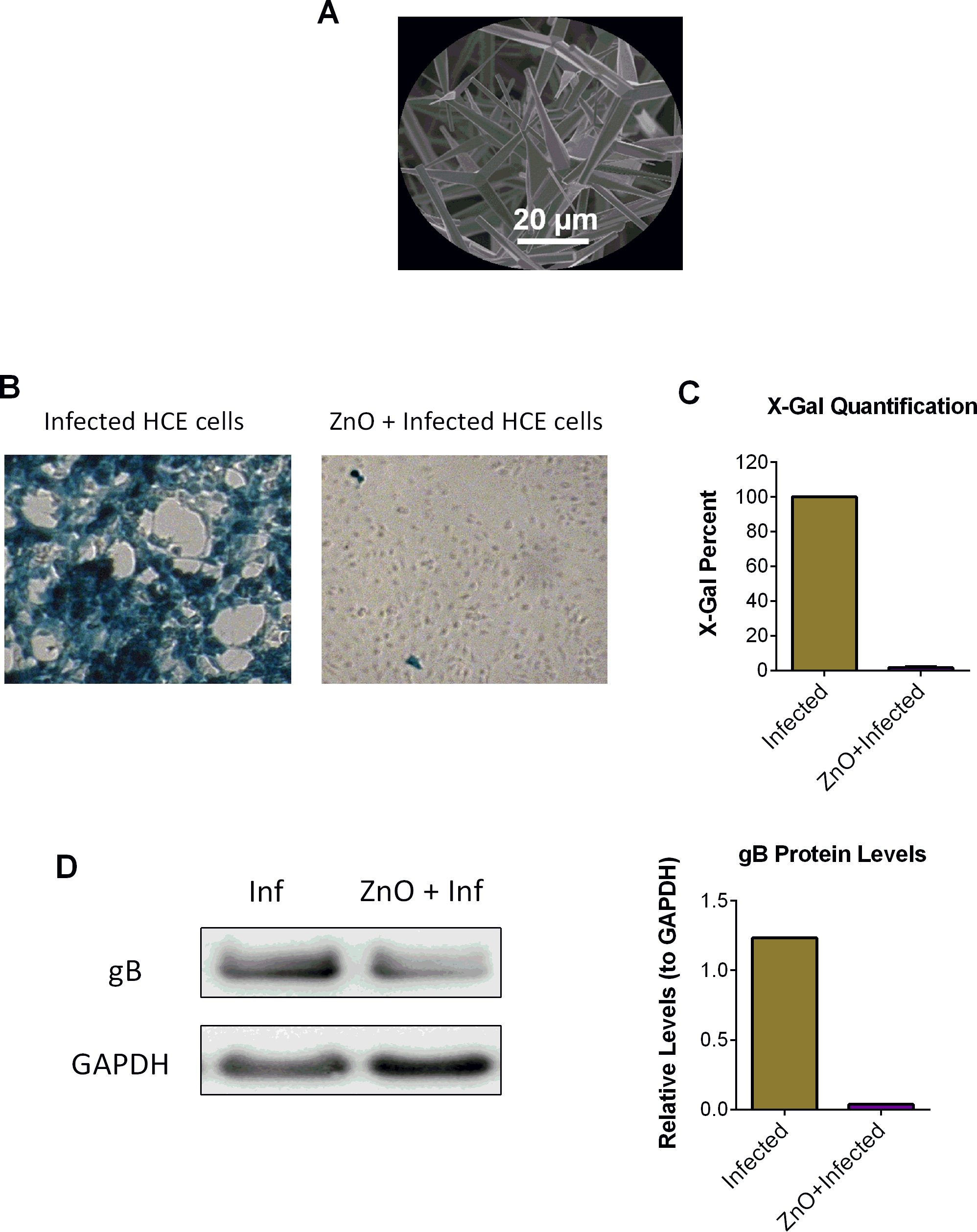 Figure 3. Analysis of the antiviral, zinc oxide tetrapods in mitigating HSV-1(KOS)tk12 infection in HCE cells. A: Scanning electron microscope image of zinc oxide tetrapod nanoparticles. B: Representative bright-field microscopic images of infected and zinc oxide-treated infected HCE cells to assess viral entry