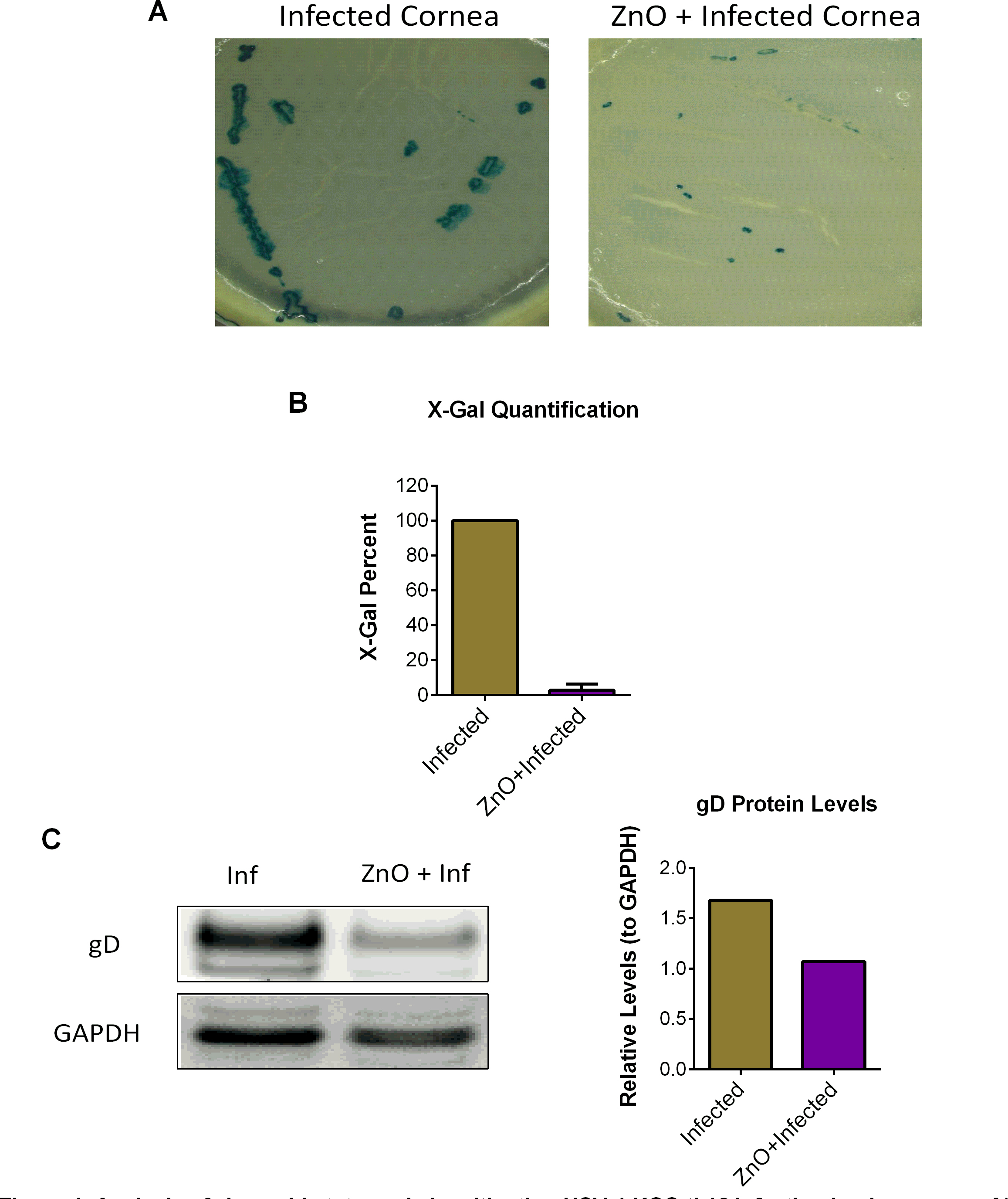 Figure 4. Analysis of zinc oxide tetrapods in mitigating HSV-1(KOS)tk12 infections in pig corneas. A: Representative modular stereo microscope imaging of infected and zinc oxide-treated infected pig corneas to assess viral