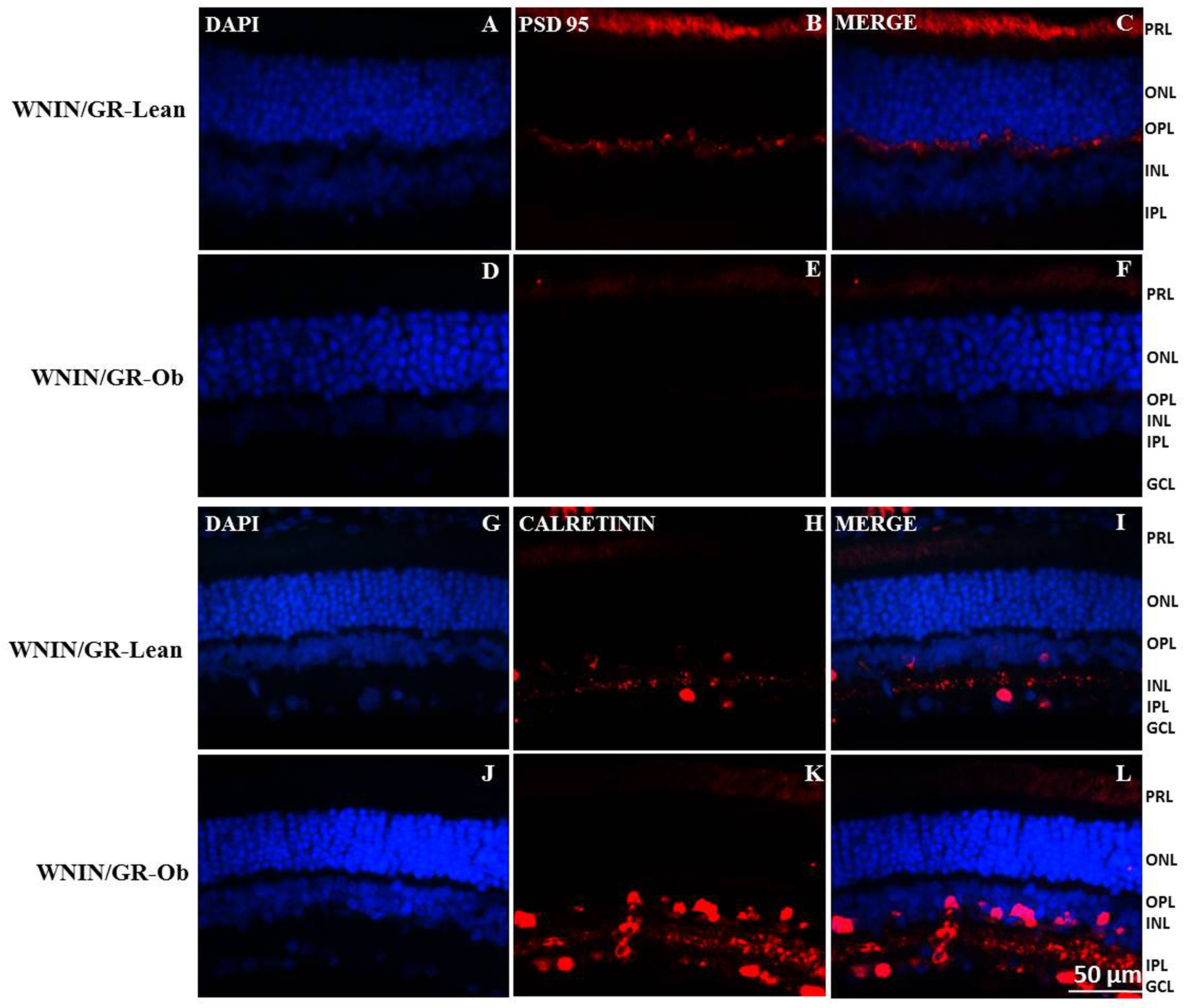 Figure 3. Immunohistochemical evaluation of expression of postsynaptic density protein 95 (PSD-95) and calretinin in 12-month-old WNIN/GR-Ob