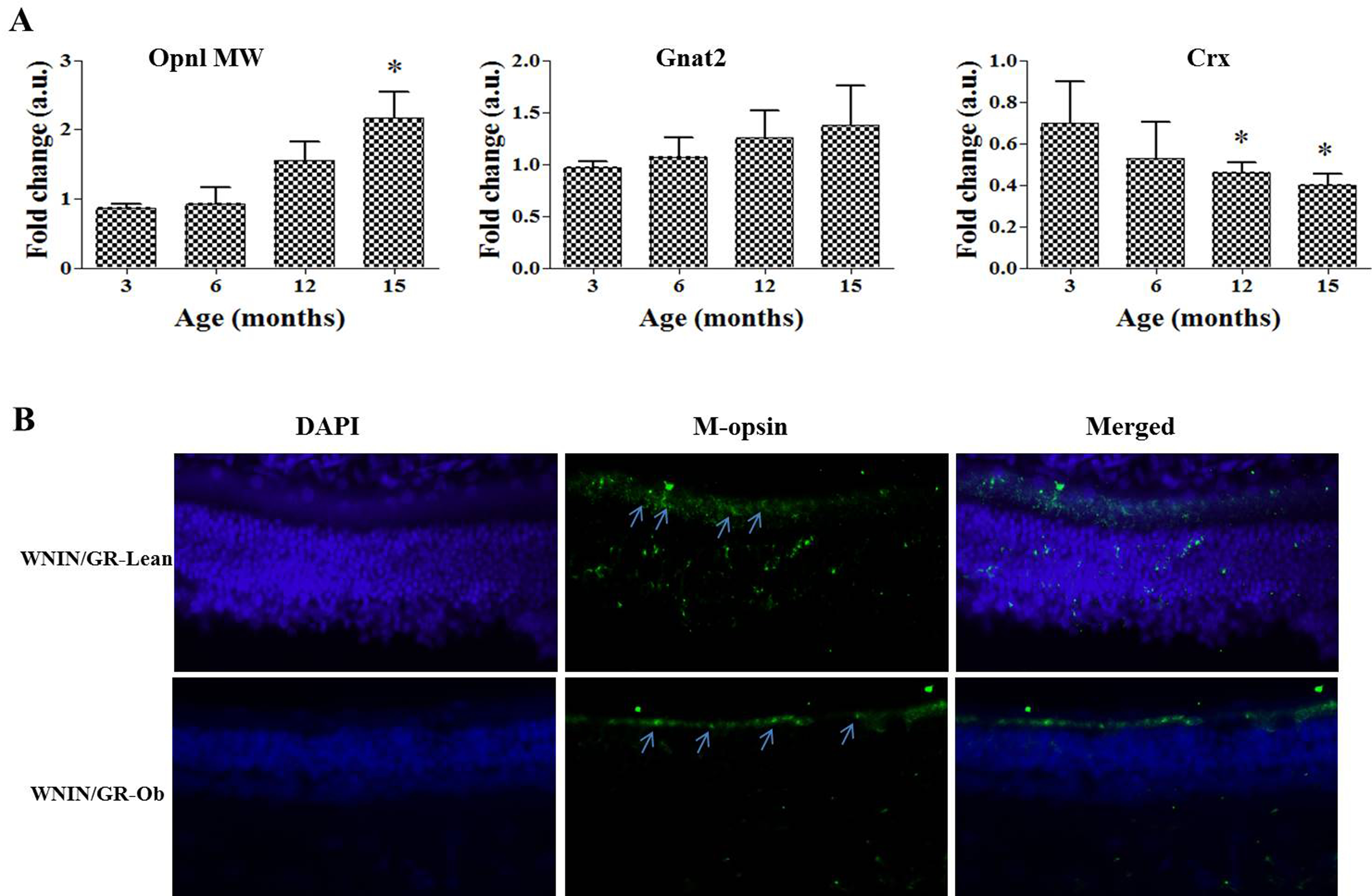 WNIN/GR-Ob rats. Data represent fold change (mean ± standard deviation [SD]) over respective age-matched lean rats (n = 3; “*” p<0.05). “*” significantly different from the respective age-matched lean rats at p≤0.05. B: Immunohistochemical evaluation of expression of cone marker M-opsin in 12-month-old WNIN/GR-Ob and respective lean rats.