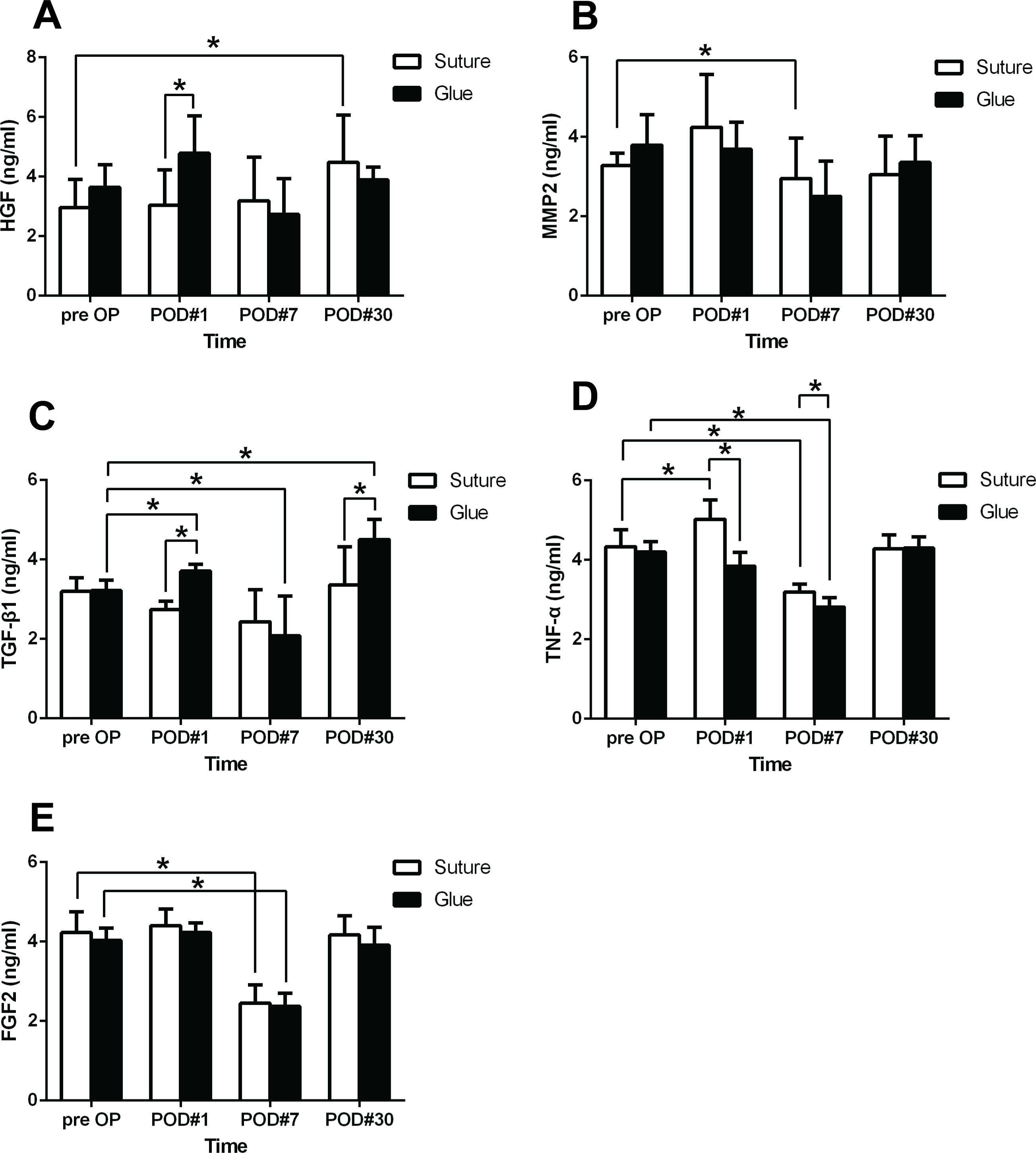 and the glue group (n = 28) before surgery and at postoperative day 1, 7, and 30. Each experiment was repeated three times.