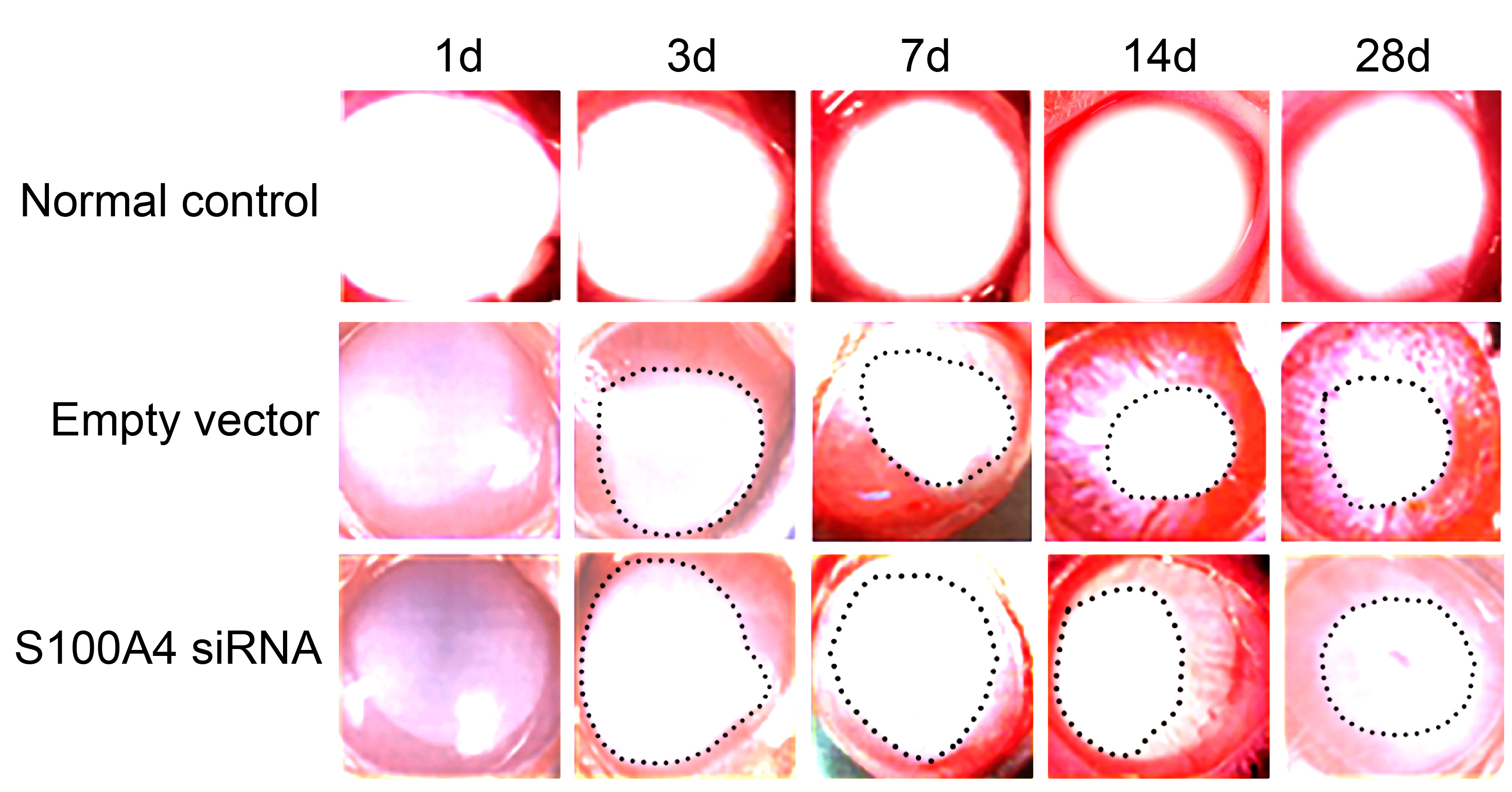 Growth of CNV after alkali burns at each time point (× 400). Notes: The dotted line represents the edge of CNV; CNV, corneal neovascularization.