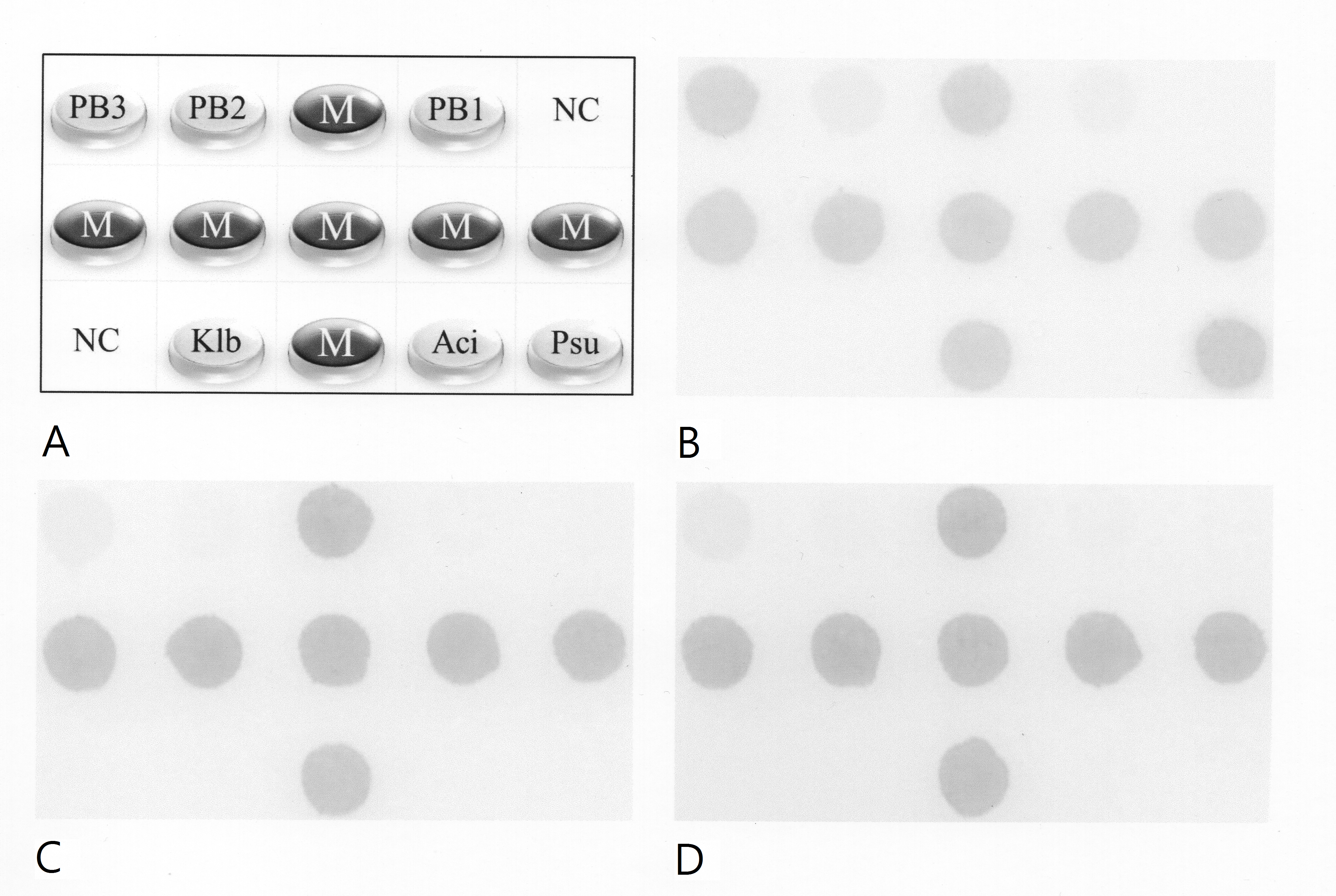 Klebsiella species, respectively. Probe sequences for all dots were shown in our previous study [