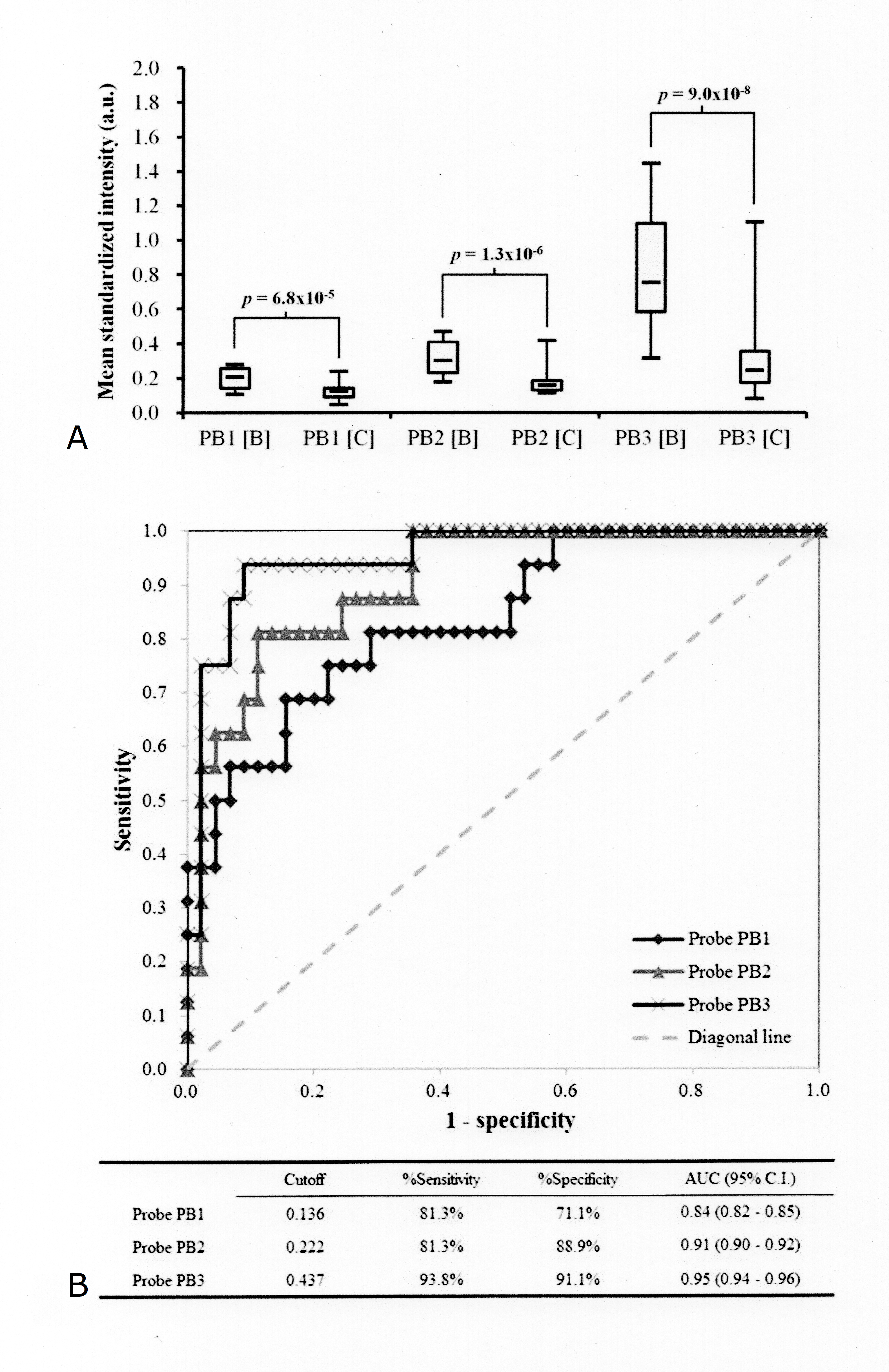 Figure 2. The probe PB3 is the most valid probe among the three universal bacteria probes for diagnosing bacterial keratitis. A: Comparison of standardized hybridization intensities between bacterial keratitis [B] (n = 16) and non-bacterial keratitis