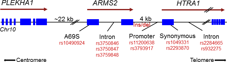 genes, as well as the locations of the SNPs that have been associated with risk for AMD by published GWASs and genetic studies.