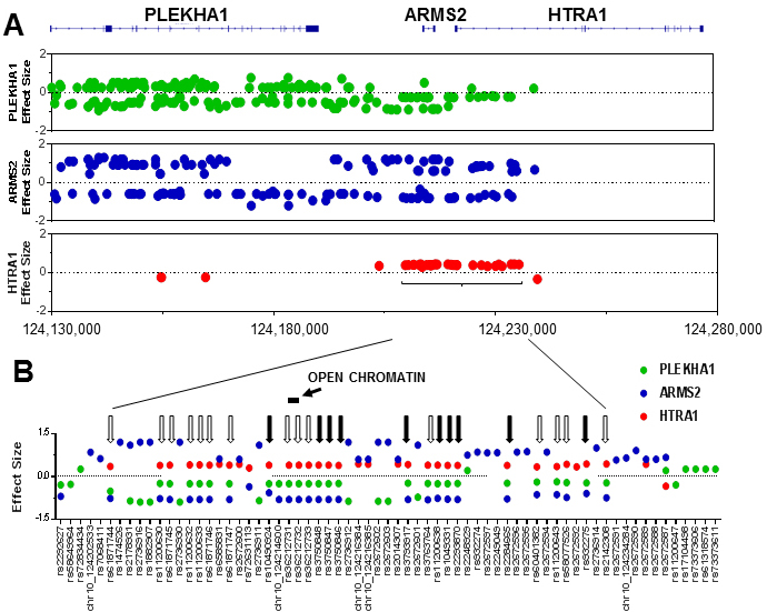 HTRA1 genes. Under the schematic genome segment are three graphs with each graph showing the locations of SNPs that affect the