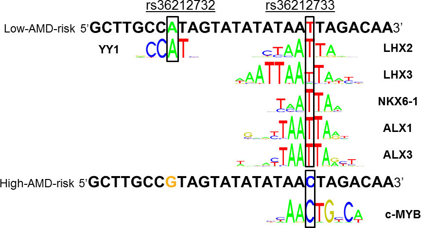 haplotype, the high-AMD-risk haplotype has a predicted reduction in the binding of the transcription factor YY-1, LHX2, LHX3,