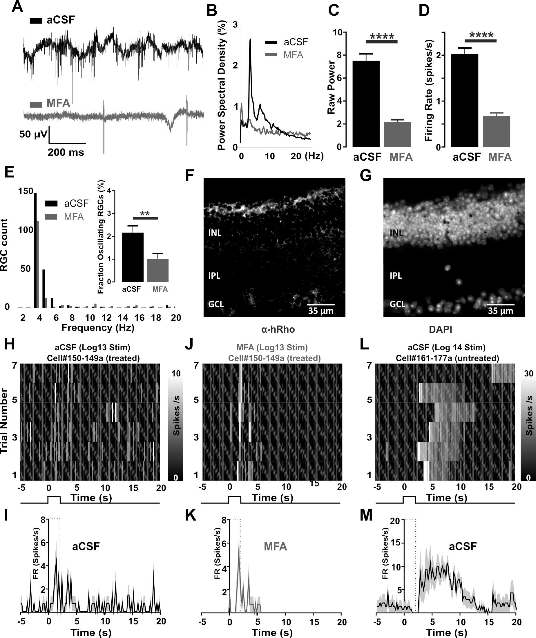 E: Distribution of the peak frequencies of all recorded RGCs crossing a normalized power threshold of 9%. Insert: Fraction