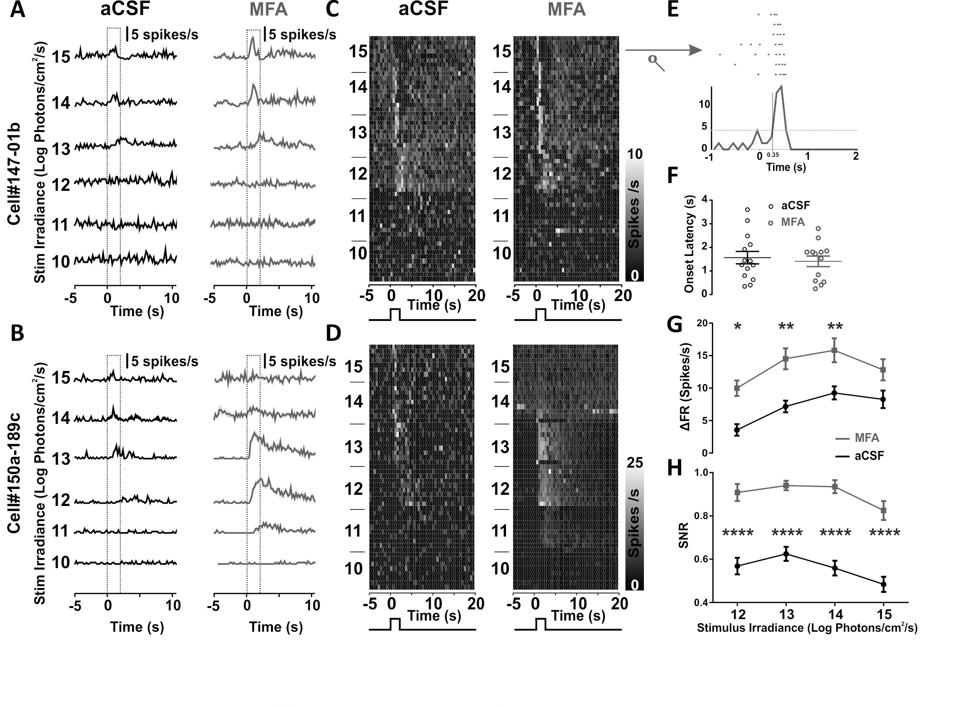 each cell; n = 15 retinal ganglion cells (RGCs). G-H: Population data for all responding cells displaying the mean (± SEM) of the change in the firing rate (ΔFR; G) and the signal to noise ratio (SNR; H) across all trials as a function of the stimulus irradiance. Asterisks indicate a statistically significant difference between
