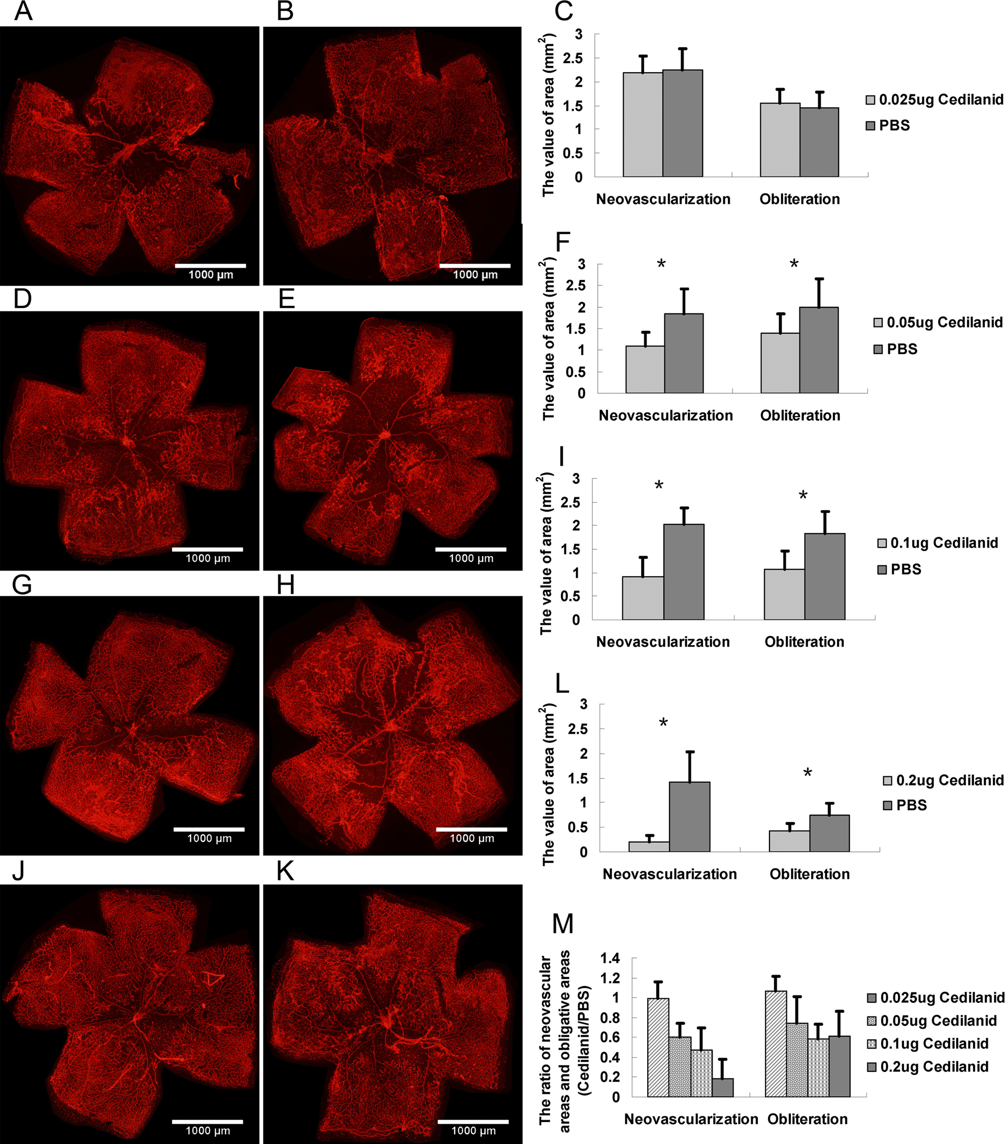 areas in eyes injected with 0.025 μg (C), 0.05 μg (F), 0.1 μg (I), and 0.2 μg (L) and control eyes injected with PBS. M: The ratios of the neovascular areas and the obliterative areas in eyes injected with different doses of cedilanid to the