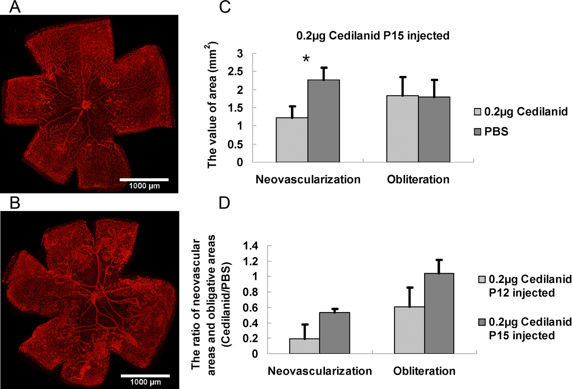 with PBS; n = 10. *p<0.05 versus PBS. D: The ratios of the neovascular areas and the obliterative areas in eyes injected with cedilanid to the corresponding control