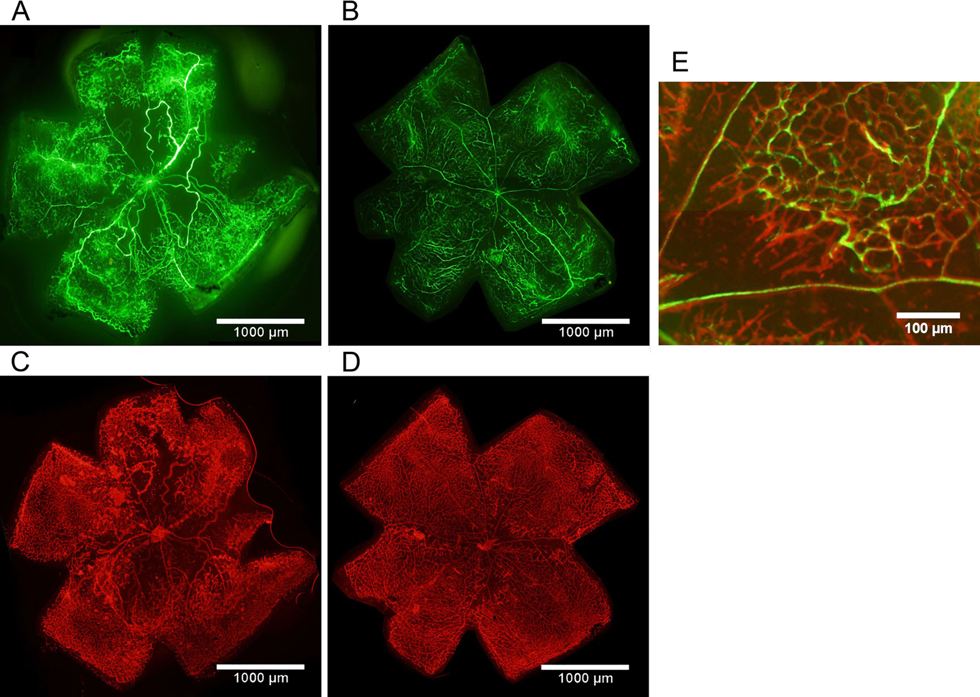 isothiocyanate (FITC)-dextran perfusion (green, A, B) and isolectin GS-IB4 staining (red, C, D) in the control eyes (A, C) and eyes (B, D) injected with 0.2 μg cedilanid. E: Merged images at a high magnification (x400).