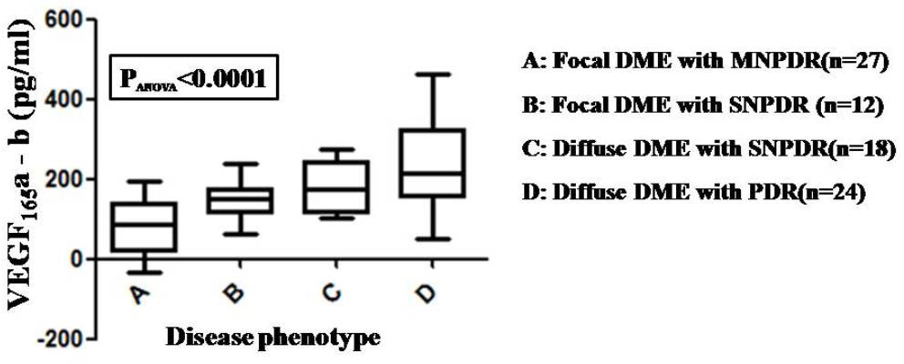 Figure 1. Box whisker plot represents the distributional difference of VEGF165a-b (pg/ml) among the different phenotypes (grades or severity) of DR. Plasma concentration of VEGF165a-b consistently increased during severity of the disease in significant manner (Panova<0.0001). Further Tukey's Multiple Comparison Test revealed that VEGF165a-b significantly elevated among Diffuse DME with SNPDR (C) and PDR (D) compared to Focal DME with MNPDR (A), Ptukeys <0.001 (A vs C) and Ptukeys <0.0001 (A vs D). Diffuse DME with PDR (D) further significantly elevated compared to Focal DME with SNPDR(B); Ptukeys <0.001 (B vs D). Level of VEGF165a-b among Diffuse DME with PDR (D) significantly elevated compared to Diffuse DME with SNPDR (C), Ptukeys <0.01 (C vs D).Data are mean± SD, sample size (n) as indicatedin figure legend.