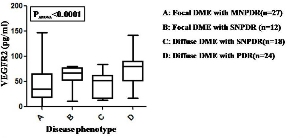 of DR. Plasma concentration of sVEGFR2 consistently increased during severity of the disease in significant manner (Panova : 0.001). Further Tukey's Multiple Comparison Test revealed that VEGFR2 significantly elevated among Diffuse DME with PDR