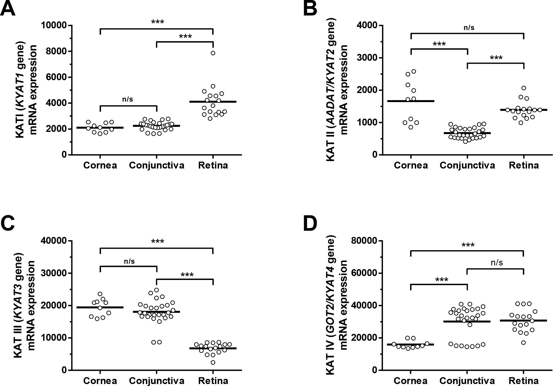Figure 1. mRNA expression of kynurenine aminotransferases in the cornea, conjunctiva, and retina. Expression of (