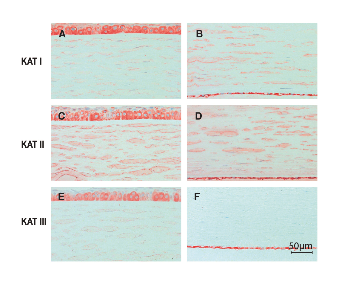 There is a slight positive staining of the corneal stroma for KAT I and II. No KAT III immunoreactivity was found in the corneal