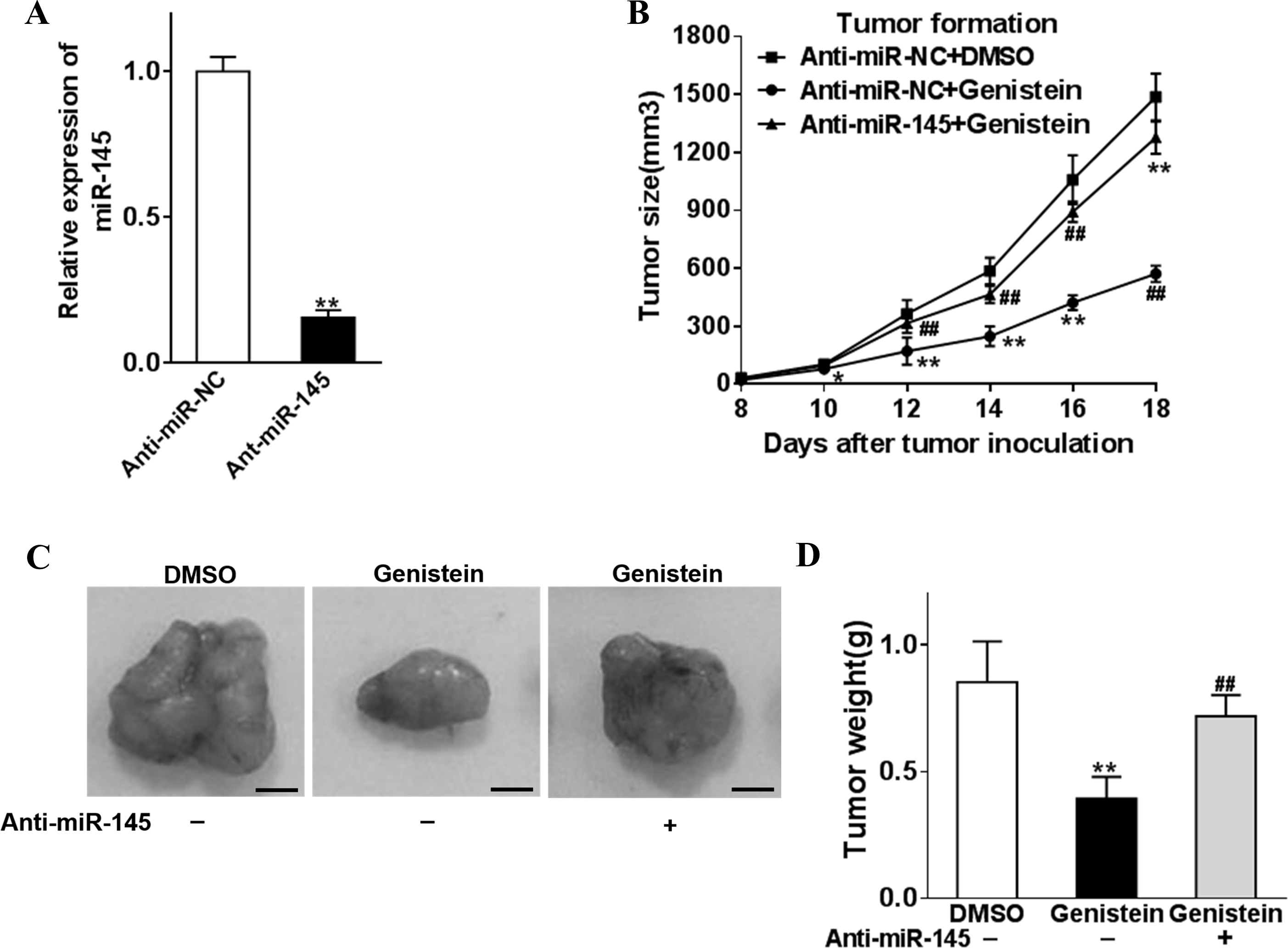 lentivirus to establish stable cell lines. A: The relative expression of the stable cells was analyzed with qRT-PCR. B–D: Anti-miR-145- or anti-miR-NC-overexpression cells (5 × 106) were dispersed in 100 μl of serum-free 1640 medium and were subcutaneously injected into each side of the posterior flank