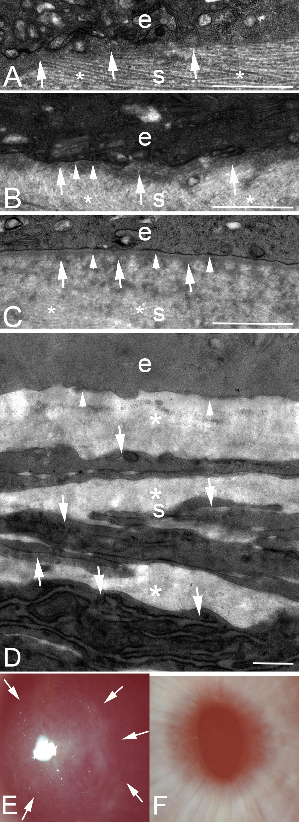 was cut such that the stacked collagen lamellas (*) are seen in the stroma. Dense deposits of extracellular matrix (arrows)