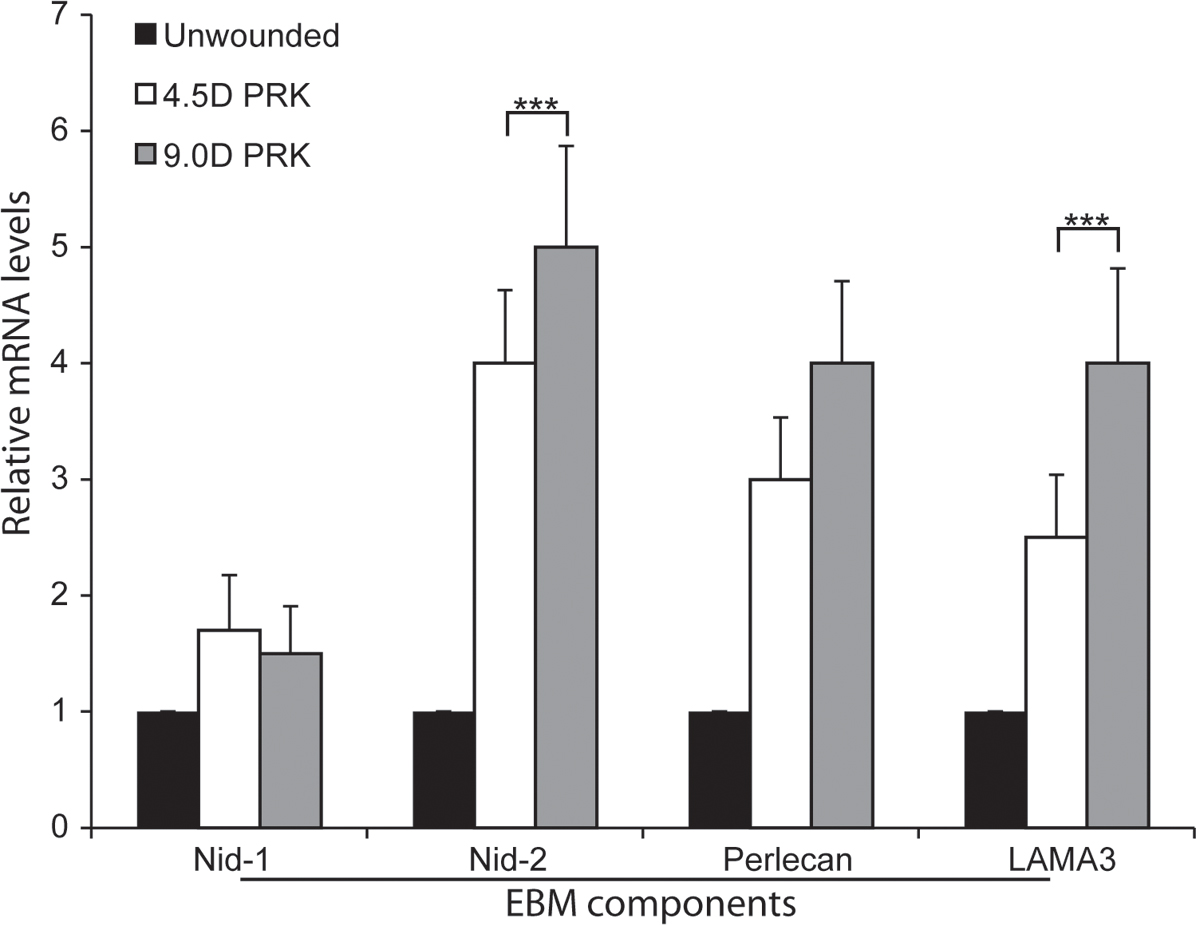 Figure 4. Analysis of EBM component mRNAs in the anterior stroma at 2 days after PRK with quantitative real-time PCR. Nidogen-1 (Nid-1)