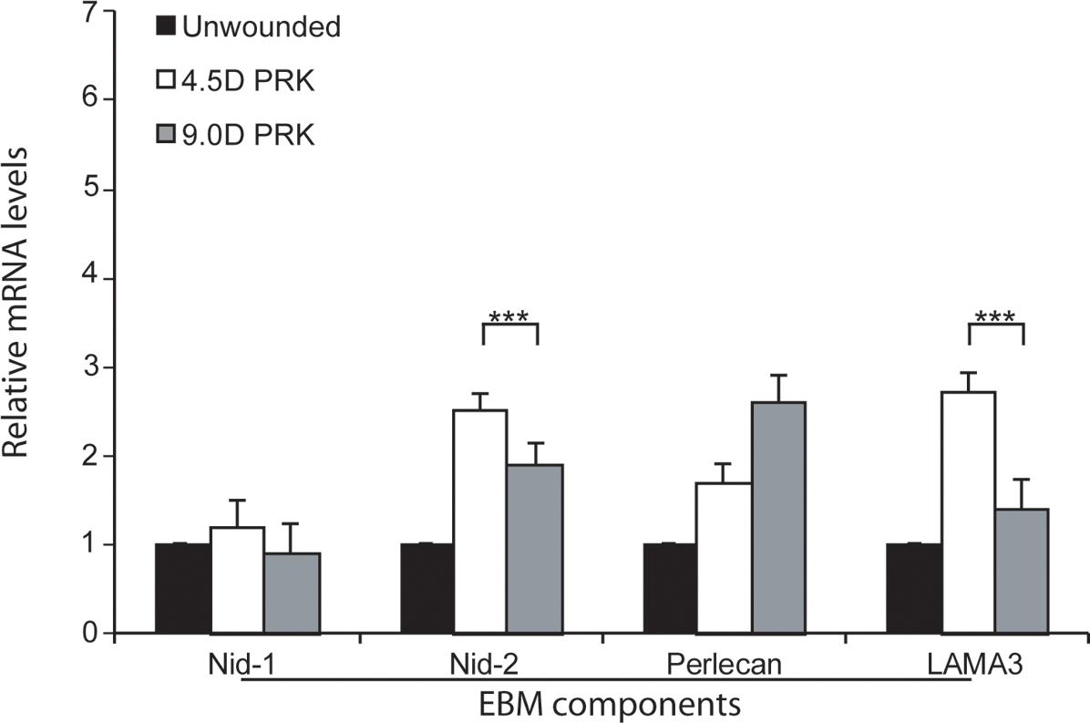 Figure 5. Analysis of EBM component mRNAs in the anterior stroma at 4 days after PRK with quantitative real-time PCR. Nidogen-1 (Nid-1)